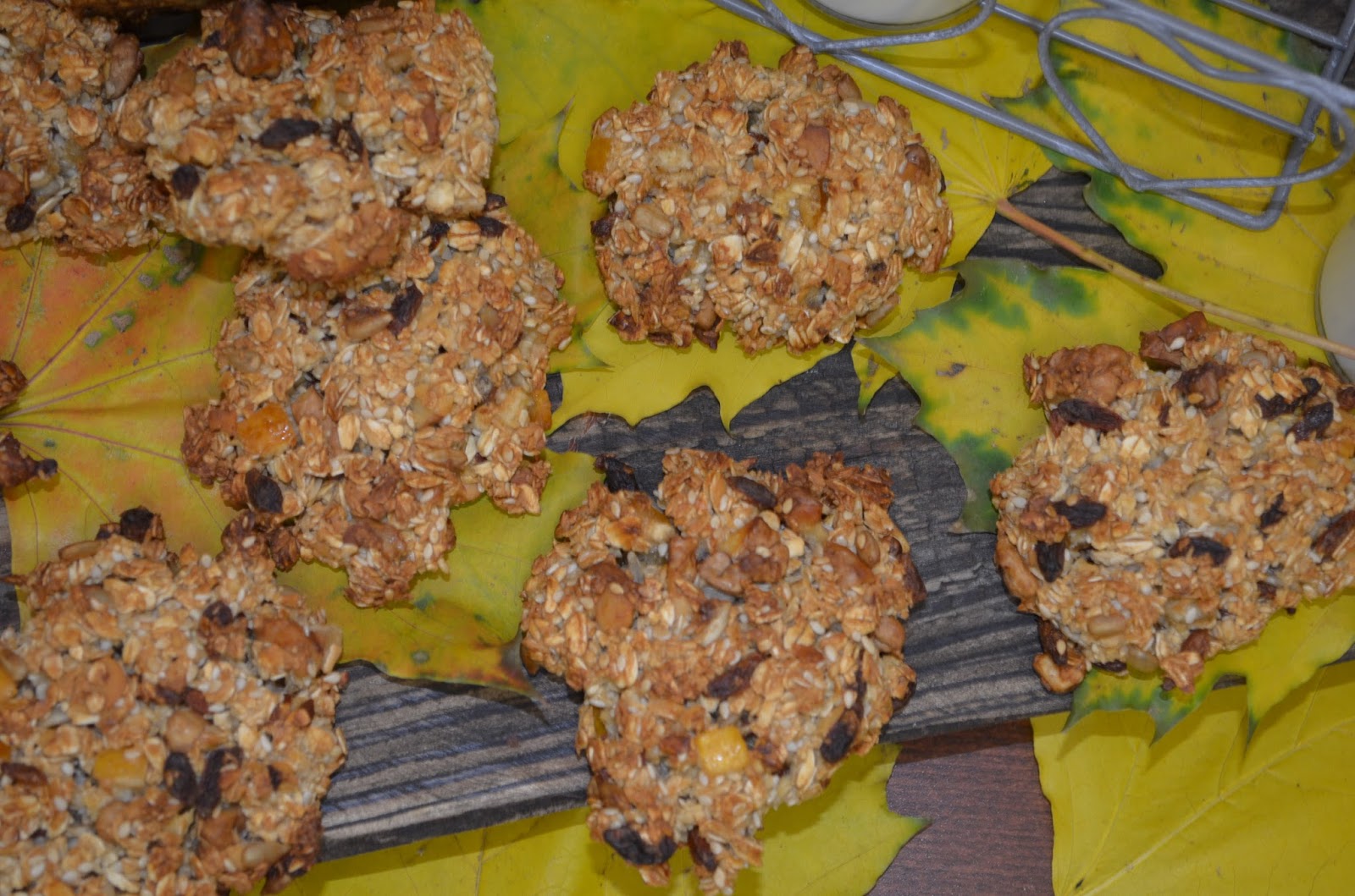 W misce mieszamy wszystkie suche składniki. Dodajemy miód, jajko i wodę. Mieszamy składniki, aż do połączenia się. Lepimy kulki wielkości orzecha włoskiego i układamy na blaszce wyłożonej papierem do pieczenia, lekko rozpłaszczamy. Pieczemy ok 20-25 minut bez termoobiegu w 180 stopniach.