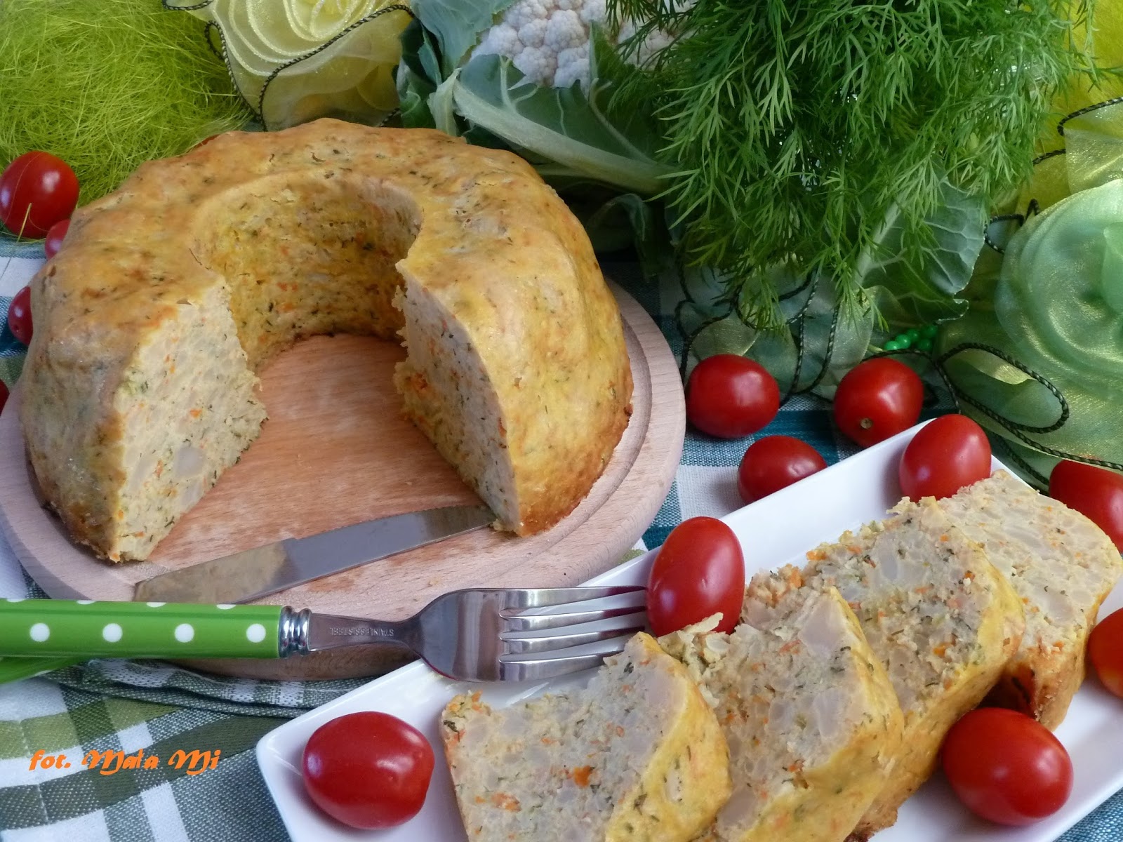 Babka kalafiorowo-serowa z marchewką, ogórkiem kiszonym i koperkiem