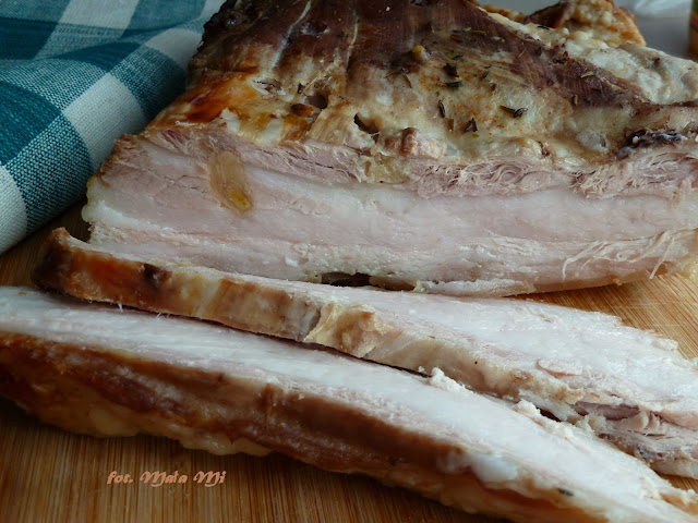 Z domowej wędliny mój Mąż najbardziej lubi boczek. Często więc piekę i szukam nowych, ciekawych połączeń smakowych. Często dodatek tylko jednej przyprawy zmienia smak całości. Ja akurat nie przepadam, wręcz nie lubię takich tłustych "smakołyków". Dlatego korzystając z tego, że piekarnik i tak "chodzi" od razu piekę też schab czy szynkę :) tym razem piekłam schab, ale zdjęcia mi nie wyszły, więc pokażę jak upiekę taki sam po raz drugi :)