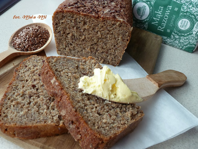 Kiedyś koleżanka powiedziała mi, że piecze tylko chleby pełnoziarniste i razowe oraz, że najczęściej takie szybkie, że jest w stanie upiec z rana zanim domownicy wstaną. Dała mi przepis, dodałam do niego siemię lniane, olej i oprószyłam wierzch mąką. Mój pierwszy razowy chleb.