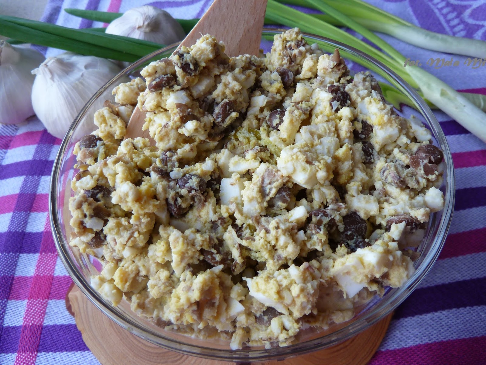 Sposób przygotowania:Jajka kroimy w kostkę dosyć drobno, dodajemy ugotowaną soczewicę, ogórek kiszony starty na drobnych oczkach tarki i chrzan. Całość mieszamy lekko jeszcze rozgniatając widelcem lub tłuczkiem do ziemniaków. Przyprawiamy do smaku solą i pieprzem (najlepiej świeżo mielonym).