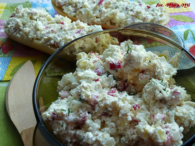 Sposób przygotowania: Ser rozdrabniamy widelcem, dodajemy masło (najlepiej wyjąć je trochę wcześniej z lodówki) i mieszamy do uzyskania jednolitej masy. Cebulę, rzodkiew, szczypiorek kroimy drobno w kostkę i dokładamy do serka, przyprawiamy i całość dokładnie mieszamy.