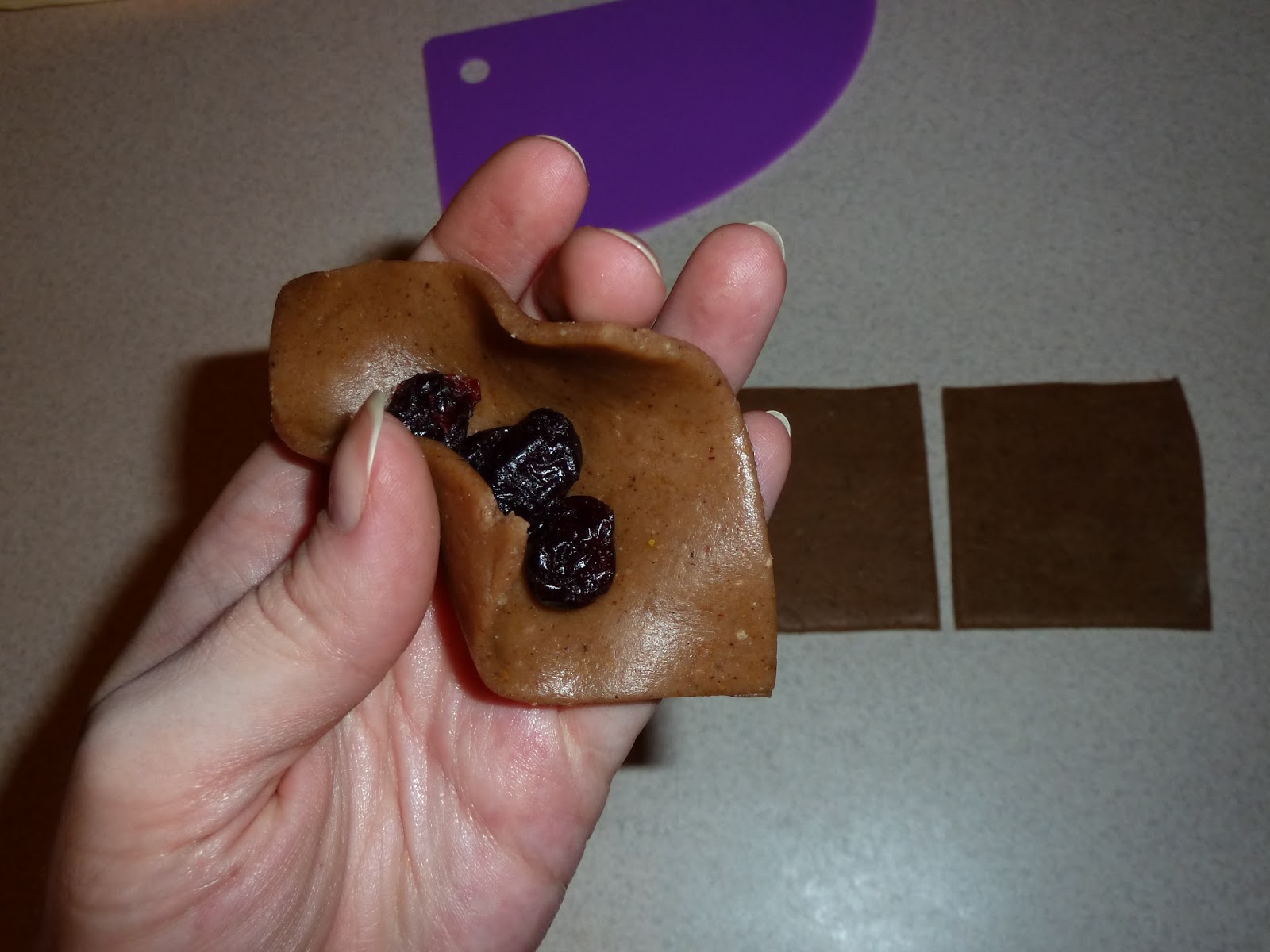 Ciasto dzielimy na kwadraty o bokach +/- 5cm. Na każdy kwadrat nakładamy 2-3 szt. suszonej żurawiny, składamy w trójkąt i zlepiamy jak pieroga (pozbywając się powietrza ze środka) i owijamy na palcu formując "uszko" - zlepiamy rogi.