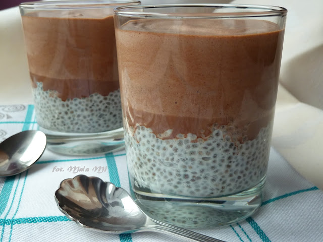 Do szklanek/pucharków nakładamy warstwę mleczną z chia, a na wierzch mus kakaowy.