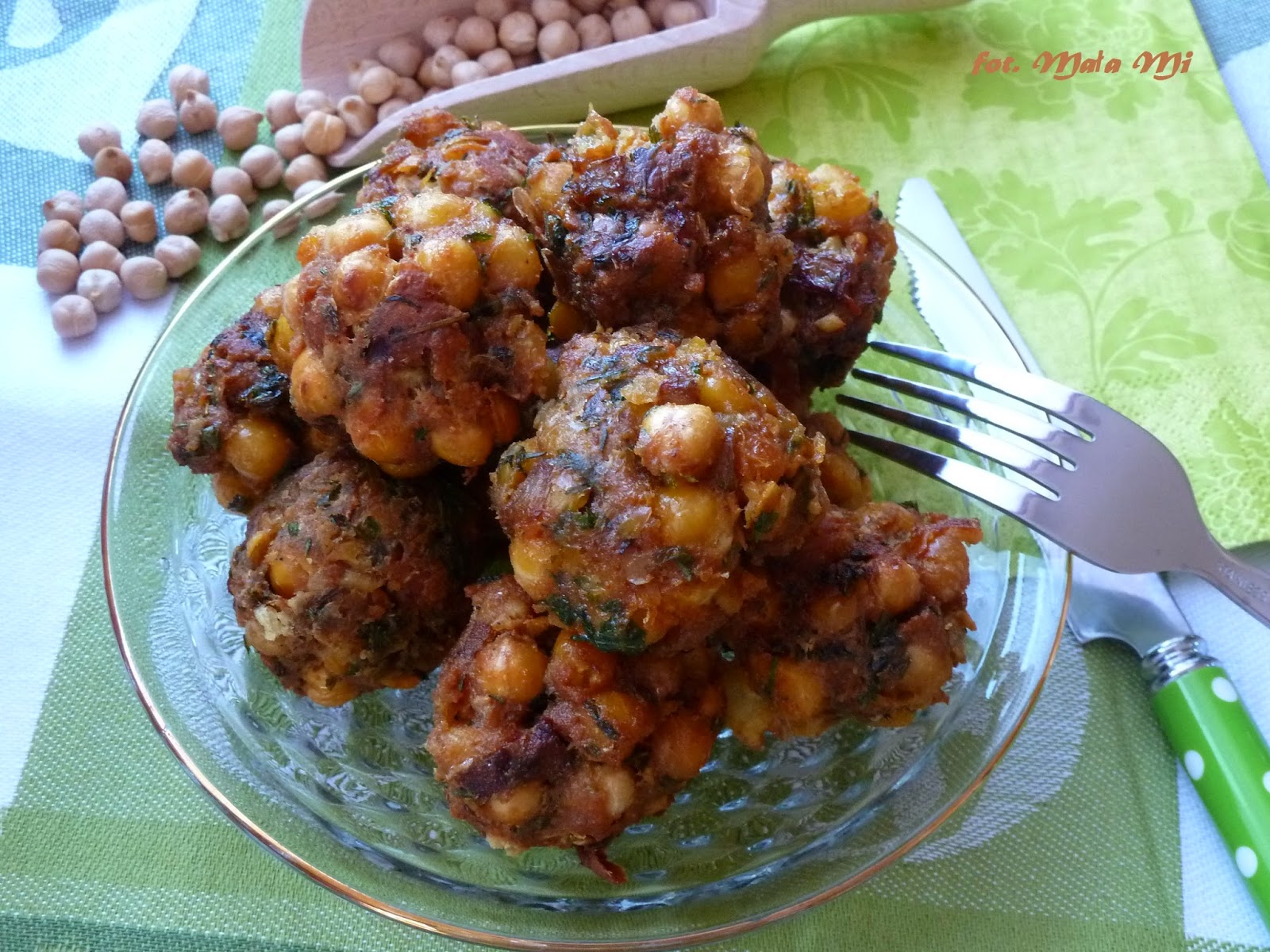 Sposób przygotowania: Na patelni rozgrzewamy odrobinę oleju, rumienimy posiekaną cebulę wraz z sosem sojowym. W misce łączymy ugotowaną cieciorkę z cebulą, wbijamy jajko, przyprawiamy. Całość dokładnie wyrabiamy na jednolitą masę. Formujemy kuleczki i smażymy w głębokim tłuszczu z każdej strony na rumiano (na wolnym ogniu).