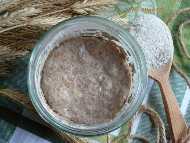 Pierwszego dnia do wyparzonego słoika wsypujemy 2 czubate łyżki mąki żytniej pełnoziarnistej i wlewamy 2-3 łyżki przegotowanej letniej wody (nie powinien być za rzadki, ale za gęsty też nie). Dokładnie mieszamy, słoik przykrywamy gazą lub ściereczką (musi mieć dostęp powietrza i oddychać), obwiązujemy i odstawiamy w miejsce ciepłe - najlepiej minimum 24 stopnie, a im cieplej tym lepiej, ale bez przeciągów (ja postawiłam przy rurce od grzejnika, z dala od drzwi). Następnego dnia i w dni kolejne (zawsze o tej samej porze) czynność powtarzamy i dokładnie mieszamy zawartość słoika z nową porcją mąki i wody. Już drugiego dnia zauważymy lekkie bąbelki powietrza, a z każdym dniem będzie ich coraz więcej.