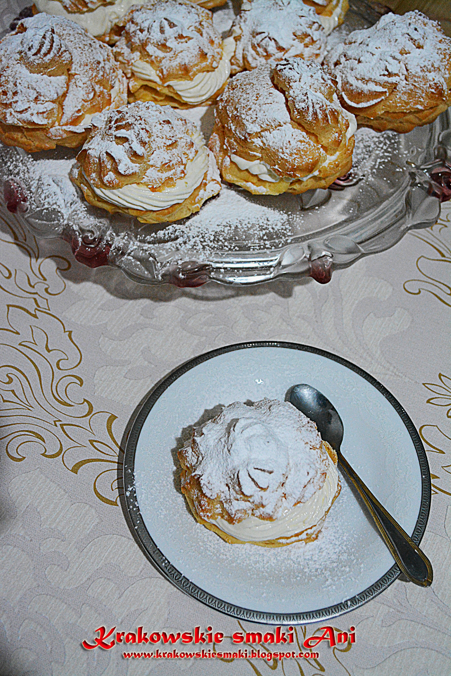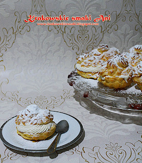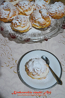 Dzisiaj po tej dłuższej przerwie chciałam Wam posłodzić. W ubiegłą niedzielę nasza mnie wielka ochota na ptysie- jednak cukiernia obok była już zamknięta a w sklepie ich nie było. W sumie nie wiem dlaczego chciałam kupić Ptysie skoro żadnego ciasta nie kupuję w sklepie a to przecież jest takie proste. W poniedziałek wzięłam się do roboty i tak oto powstały przepyszne Ptysie z bitą śmietaną oprószone cukrem pudrem- zniknęły jeszcze szybciej niż zdążyłam je przygotować:)