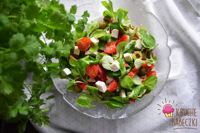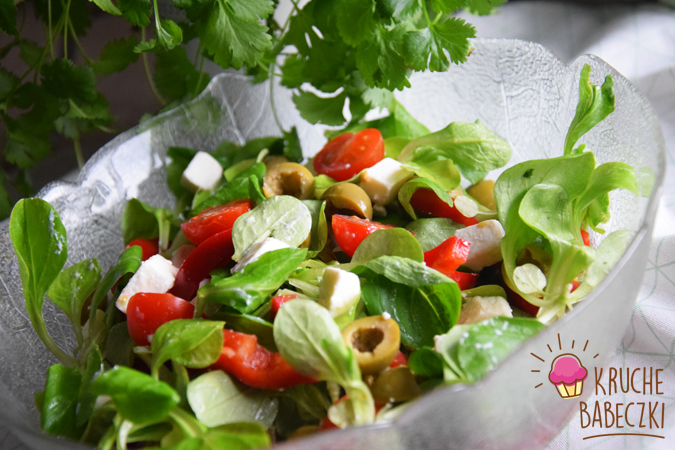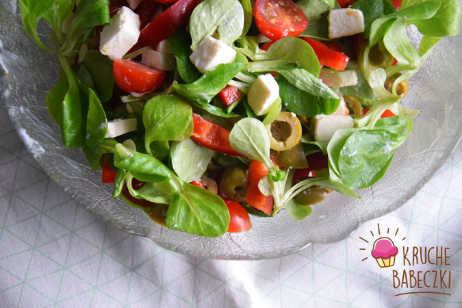 Sałatka z roszponką, papryką, serem feta, oliwkami i pomidorkami
