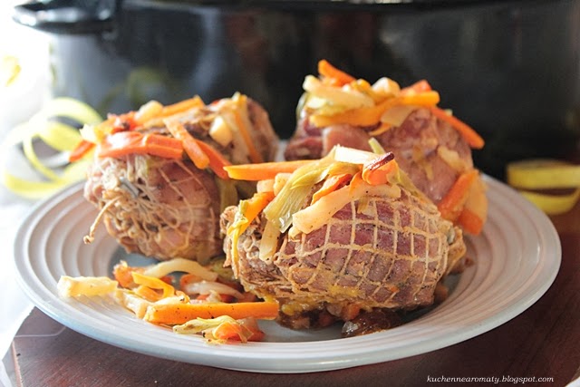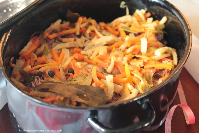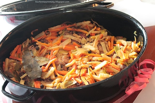 Wczoraj wspominałam o golonce w piwie, oto i ona bawarska golonka z warzywami. Podaje Wam przepis na to danie z 5 golonkami (tak właśnie brzmi on w oryginalnym przepisie w zeszycie mamy), ja jednak na własne potrzeby powiększyłam to danie do 8 golonek, wówczas musicie oczywiście zwiększyć również ilość dodawanych warzyw.