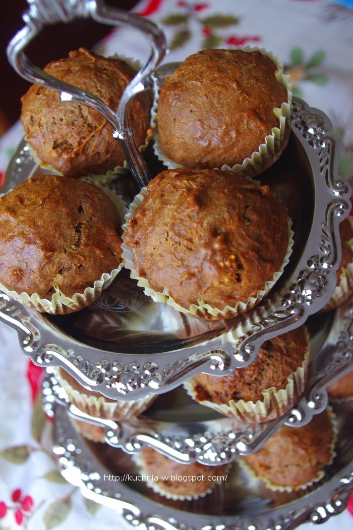 Składniki: 250 g mąki, 1 łyżeczka proszku do pieczenia, 1/2 łyżeczki sody oczyszczonej, 1 łyżeczka cynamonu, 2 łyżeczki kakao, 250 g marchwi, 2 jajka, 90 g brązowego cukru, 80 ml oleju, gałka muszkatołowa, 6 suszonych fig.