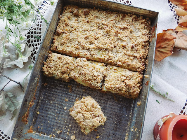 Od kilku dni pogoda jest typowo jesienna, w związku z czym postanowiłam przywitać wrzesień szarlotką. Taką na pełnoziarnistym, kruchym cieście z warstwą prażonych jabłek z cynamonem, budyniem i orzechową kruszonką...