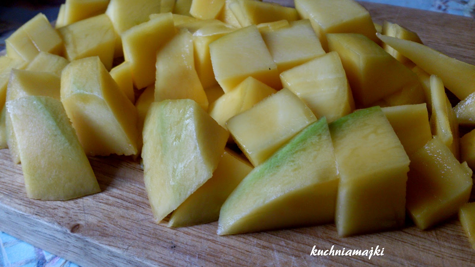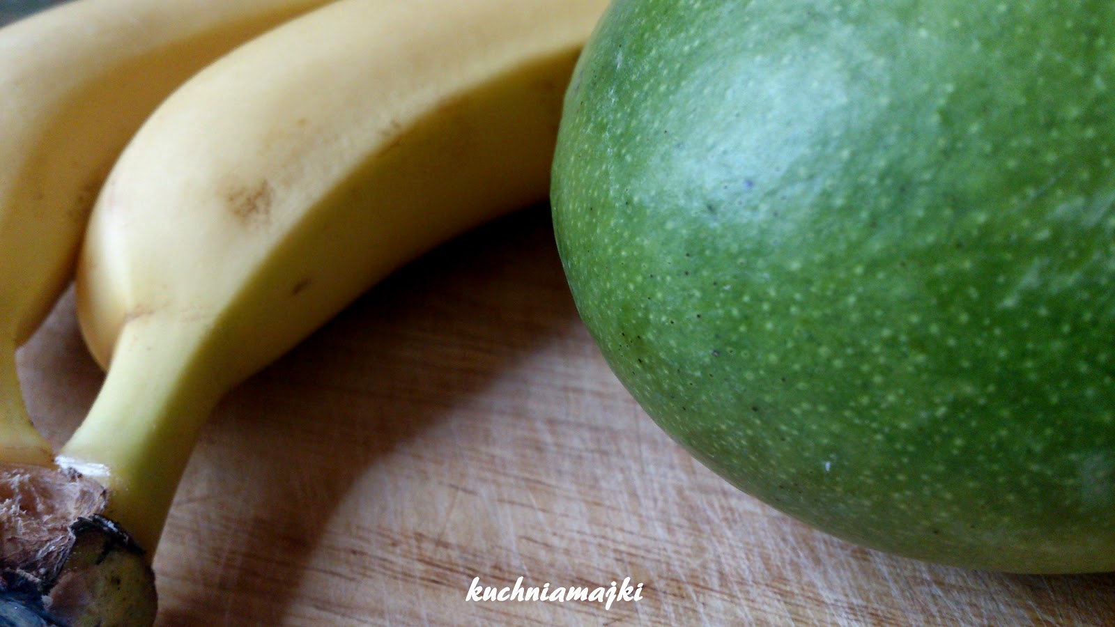 - Mango i banany obieramy ze skórki, kroimy w kostkę, miksujemy blenderem na gładki mus.