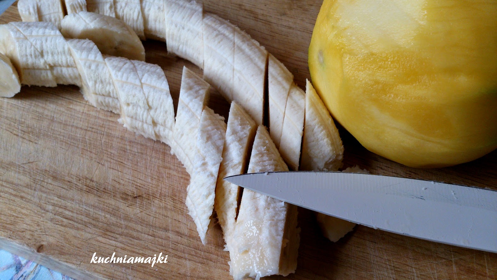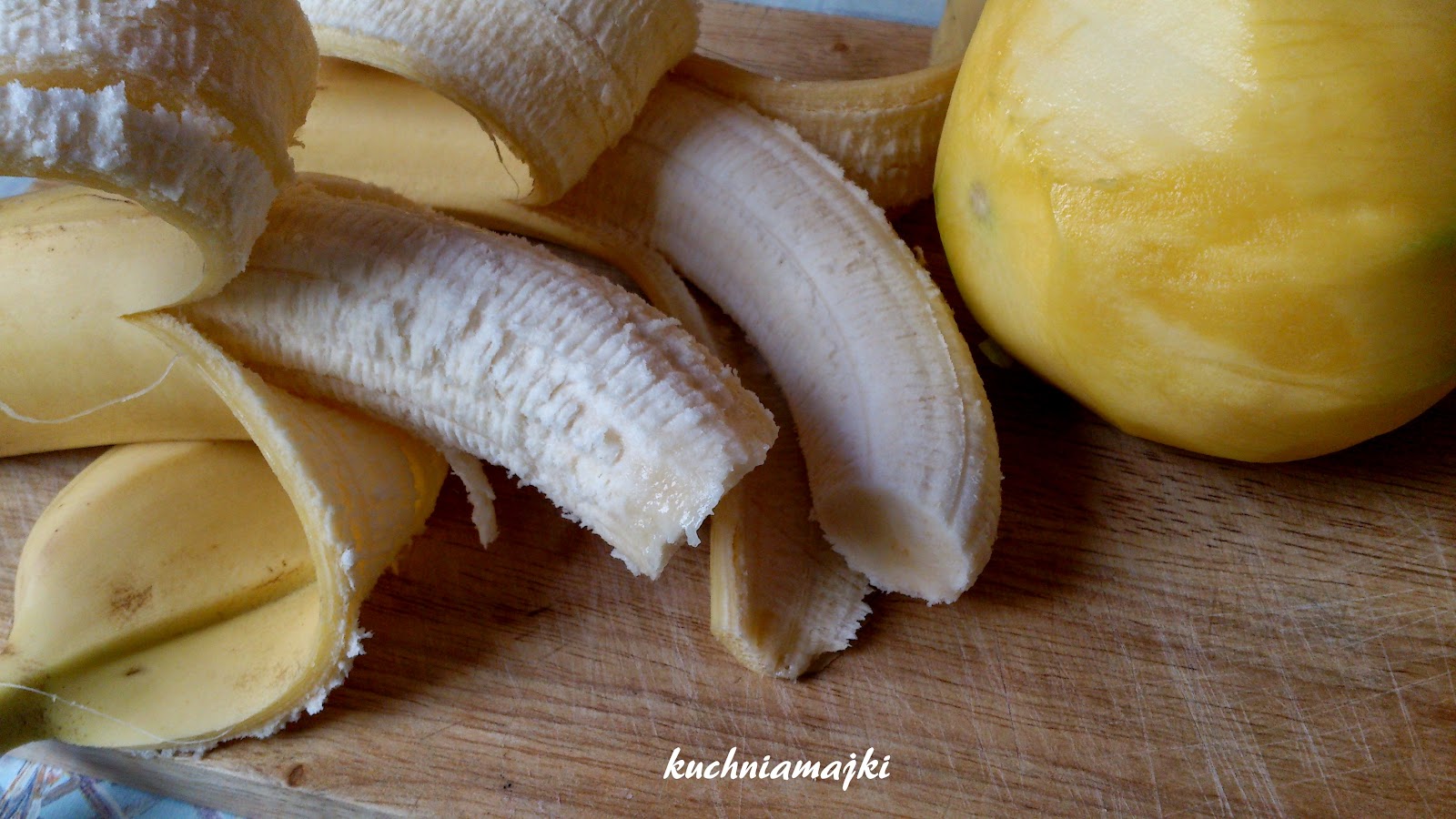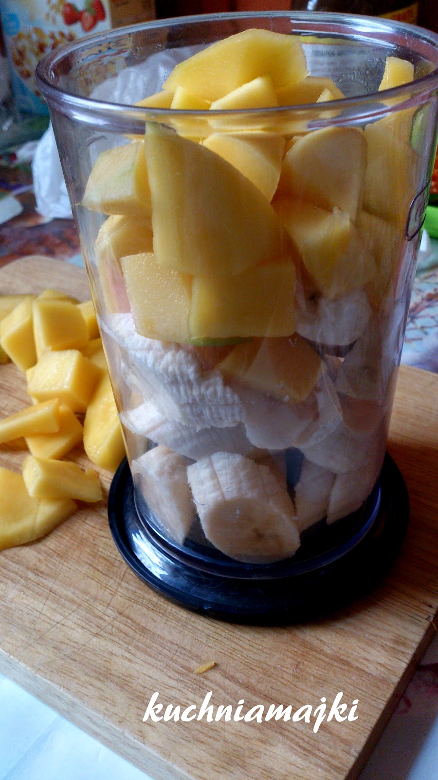 - Mango i banany obieramy ze skórki, kroimy w kostkę, miksujemy blenderem na gładki mus.