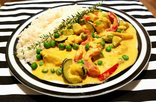 Na sam koniec dodajemy mleczko kokosowe, mango, groszek, pastę curry, imbir i chilli.