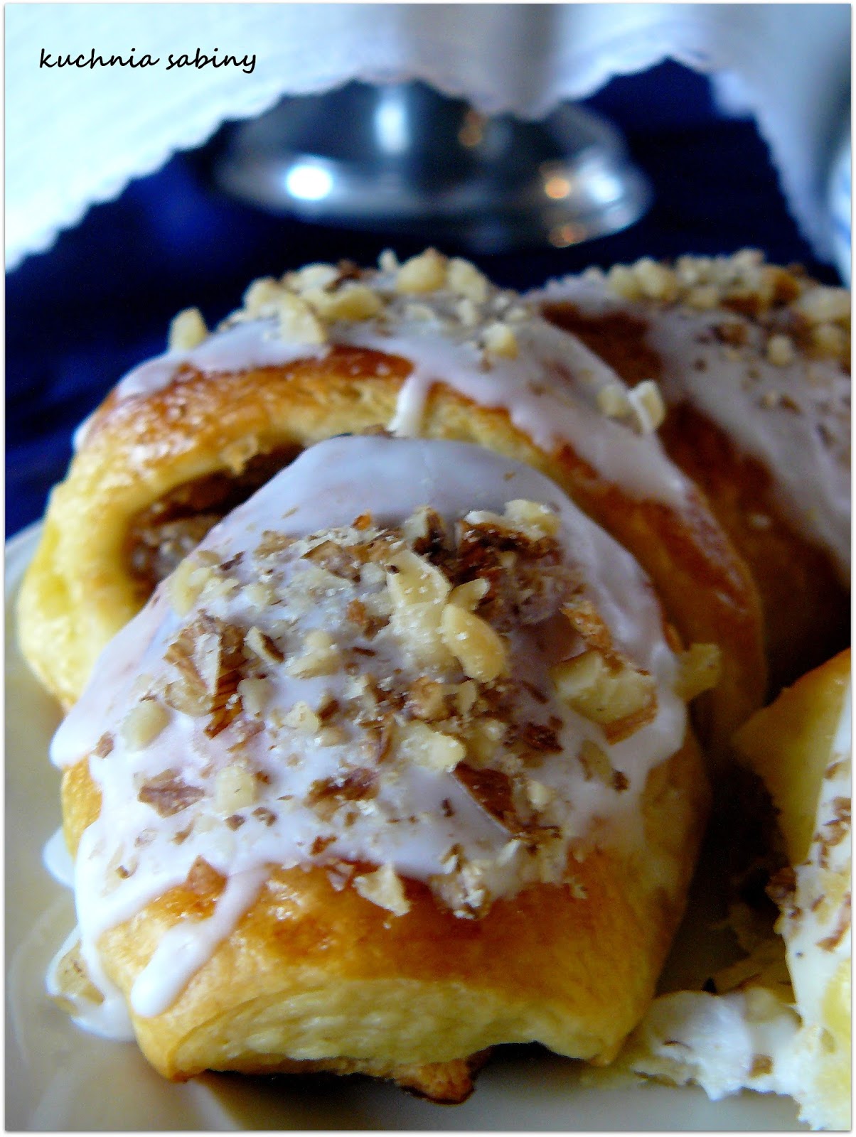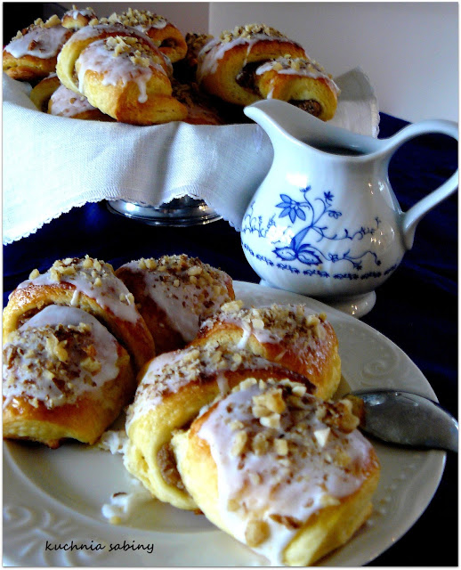 Gotowe rogale układamy na blaszce, pozostawiając pomiędzy mini spore odstępy. Odstawiamy do wyrośnięcia na około 1 h. Roztrzepanym jajkiem smarujemy rogale, rogale pieczemy w temp. 180 stopni, przez około 20-25 minut, aż się zarumienią. Jeszcze ciepłe smarujemy lukrem (wodę ucieramy z cukrem pudrem aż do powstanie gęstego kremu ) i posypujemy orzechami.