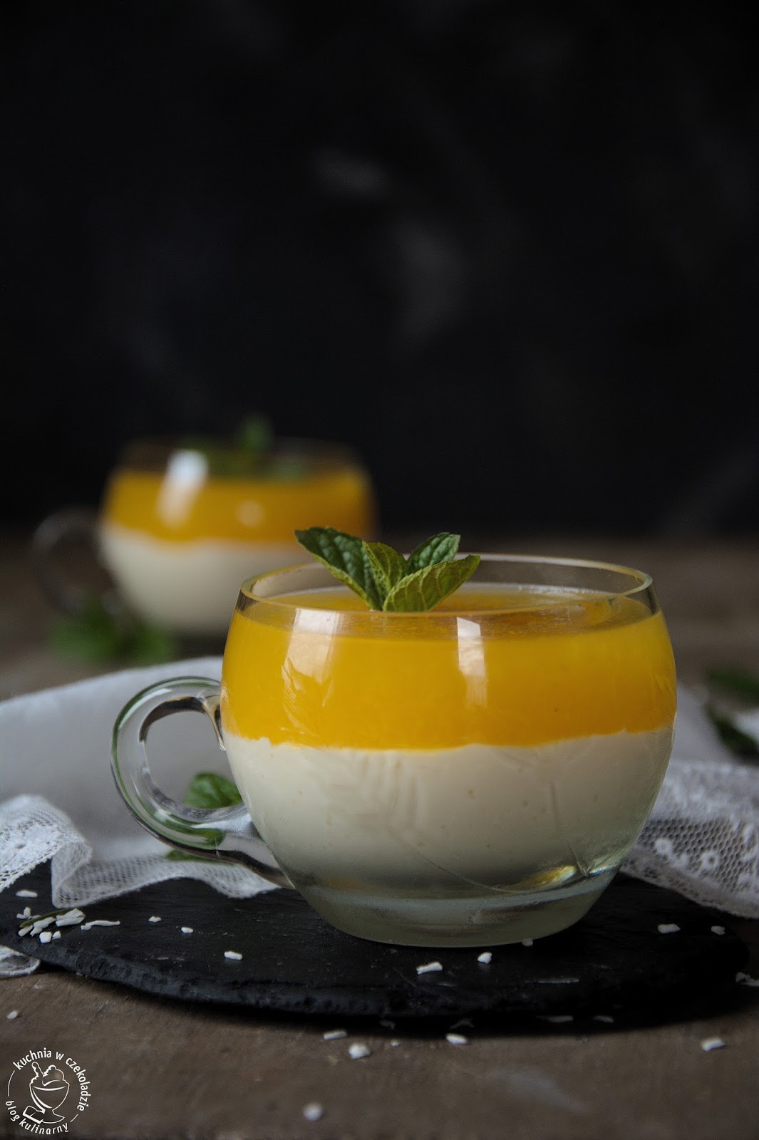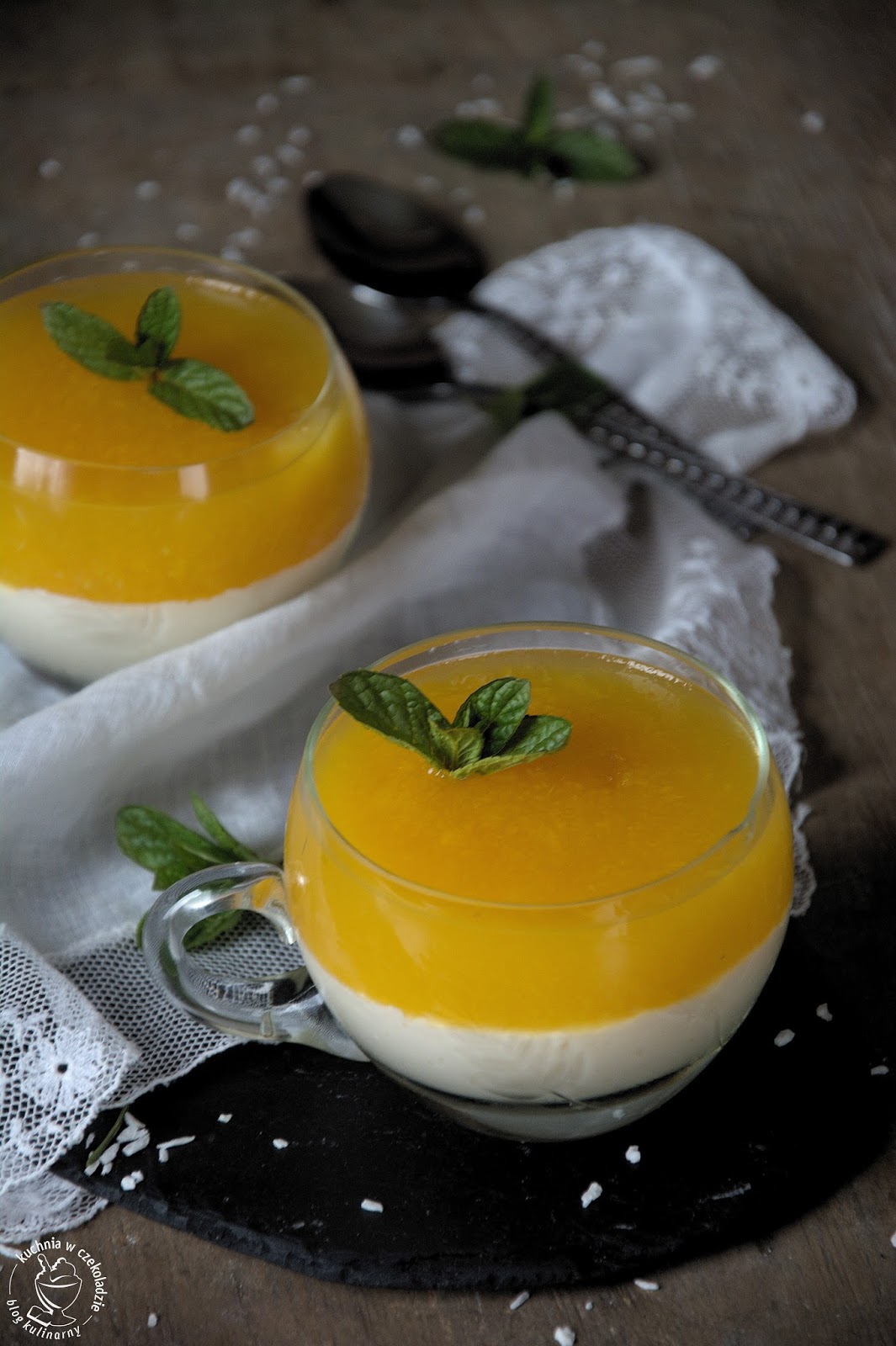 Żelatynę zalewamy odrobiną zimnej wody i mieszamy do napęcznienia. Następnie dzielimy na dwie części. Śmietankę podgrzewamy wraz z cukrem waniliowym i trzcinowym. W trakcie dodajemy mleko kokosowe. Gorącą masą zalewamy jedną część żelatyny i energicznie mieszamy. Masę rozlewamy do szklanek lub pucharków, studzimy kilka godzin.
