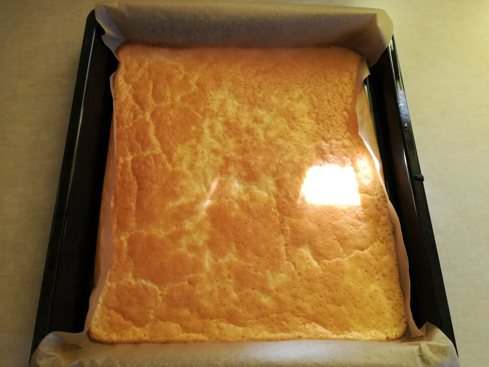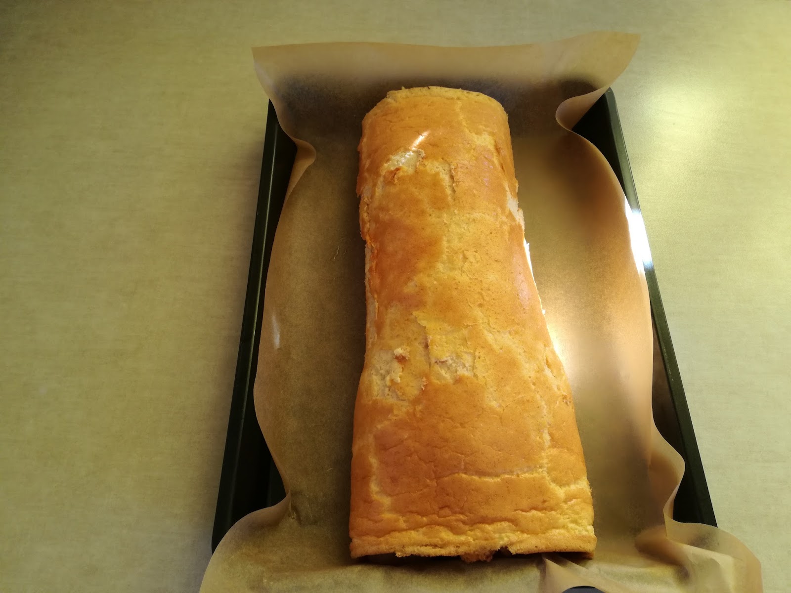 7. Delikatnie zwijamy w roladę, przekładamy ponownie na blaszkę wyłożoną papierem i zapiekamy 45 minut w 180°C.