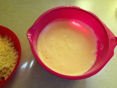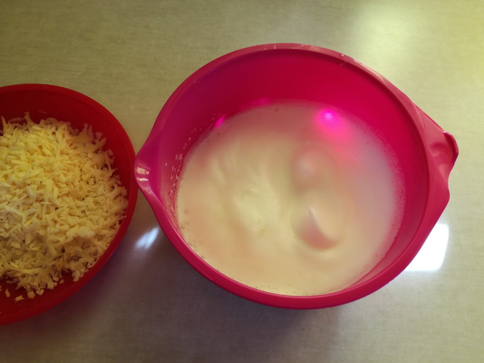 1. Robimy masę serową: oddzielamy żółtko od białek, białka ubijamy mikserem, dodajemy żółtka, majonez, ketchup oraz starty na tarce o dużych oczkach ser, wszystko razem mieszamy.