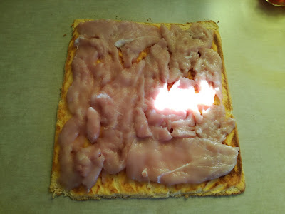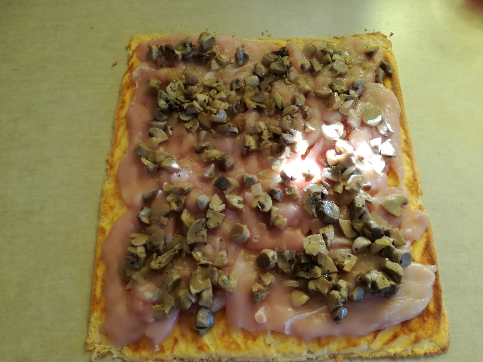 6. Gdy masa jest już gotowa wyjmujemy ją i ściągamy papier, następnie układamy po kolei mięso, pieczarki, paprykę.