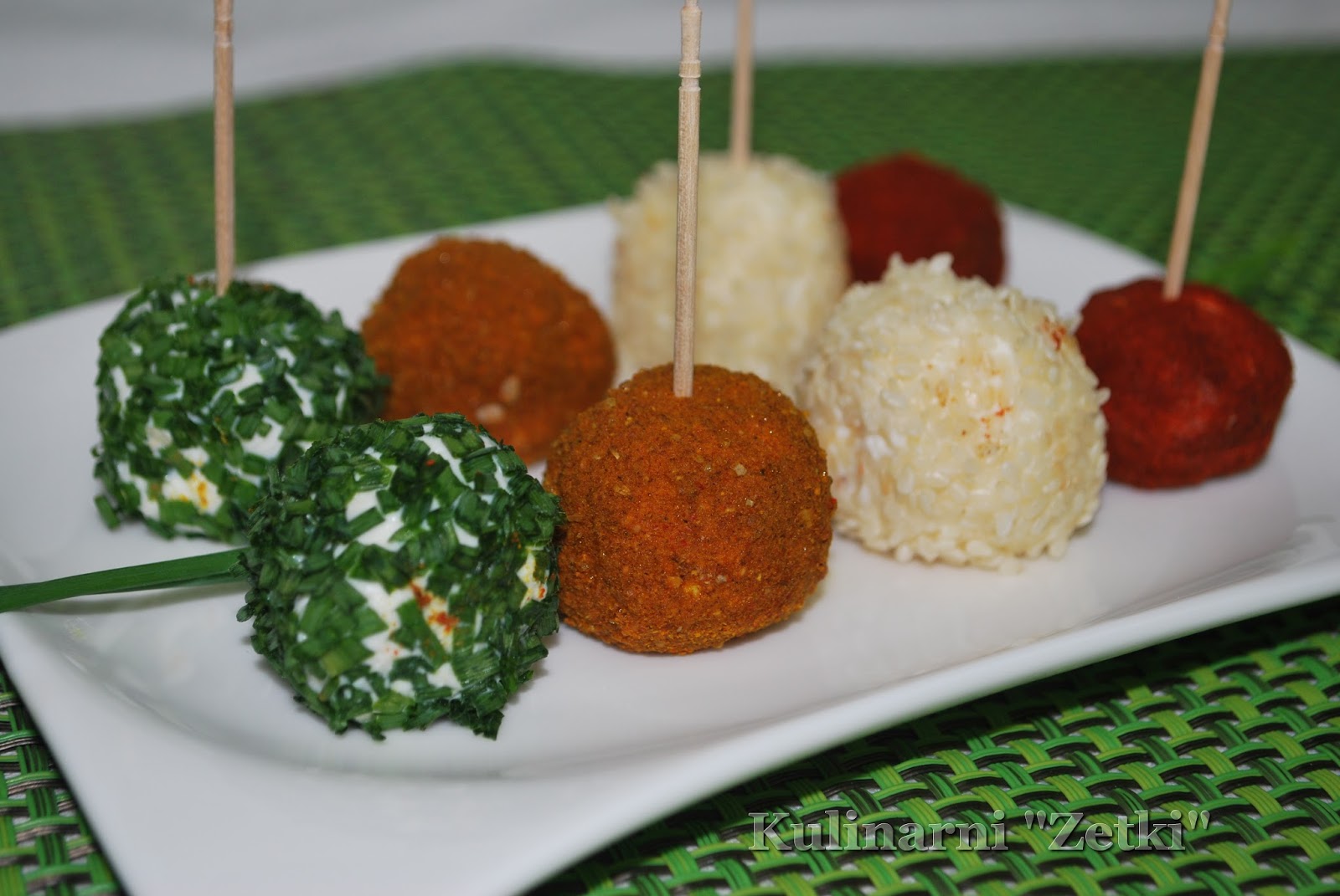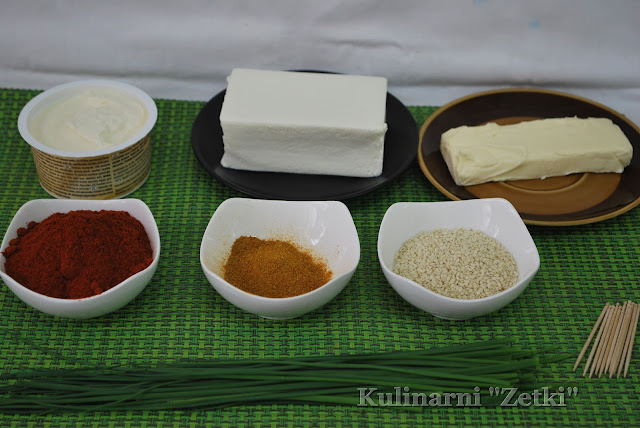 1 opakowanie sera typu feta2-3 łyżki serka puszystego śmietankowego 1 opakowanie serka topionego grubo mielony kolorowy pieprz ziarna sezamupapryka ostradrobno posiekany cienki szczypiorek kurkumawykałaczki