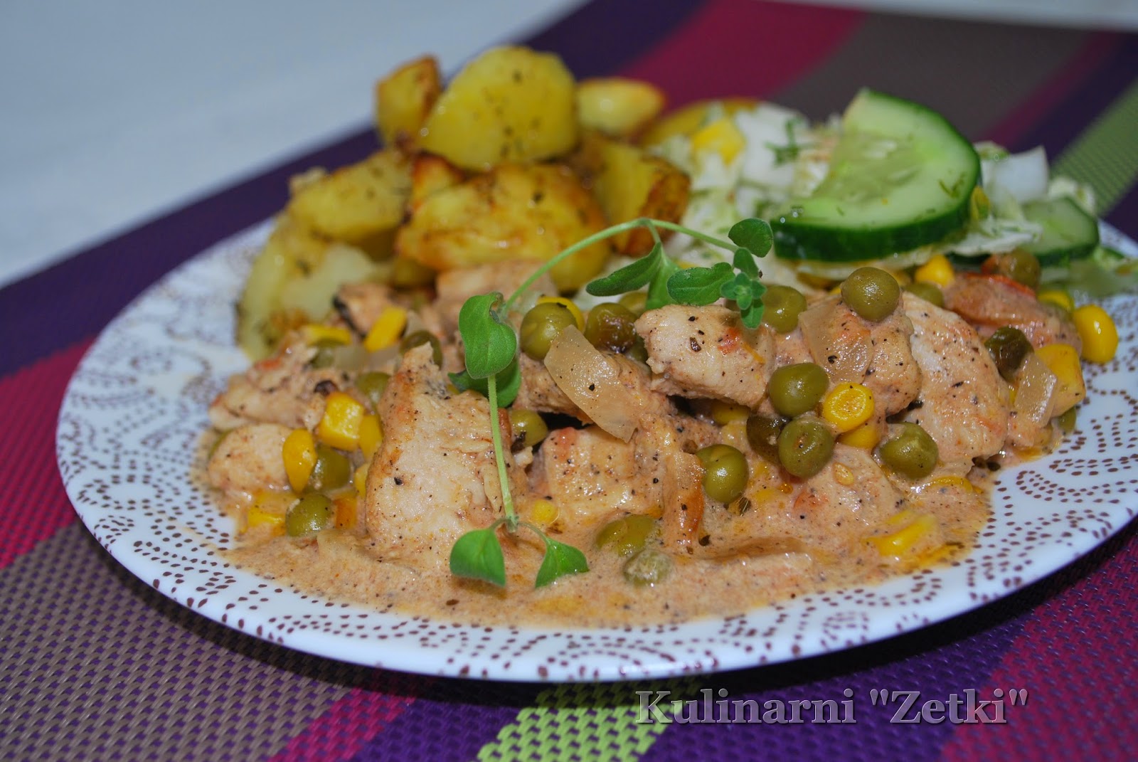 Cebulę posiekać. Zeszklić na oleju, na patelni. Dodać pomidory i serek mascarpone. Wymieszać. Dodać odsączony zielony groszek i kukurydzę oraz kilka porwanych listków bazylii. Doprawić solą, pieprzem i ewentualnie czosnkiem. Tak przygotowanym sosem polać kurczaka. Zapiekać 30 minut w temperaturze 180ºC.