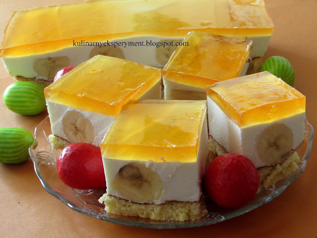 Lubicie banany, bo ja i moje dzieci uwielbiamy stąd mój pomysł na ciasto bananowe. Ciasto bardzo efektownie wygląda a jeszcze lepiej smakuje. Delikatna cytrynowa pianka z kawałkami bananów połączona w całość z galaretką brzoskwiniową.