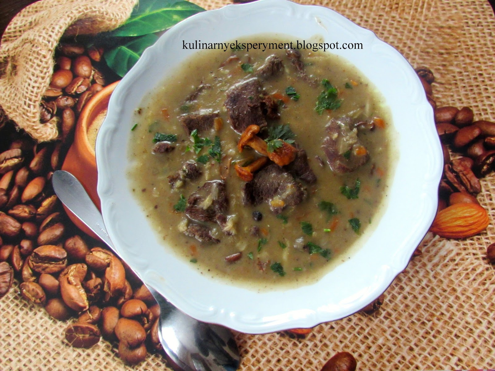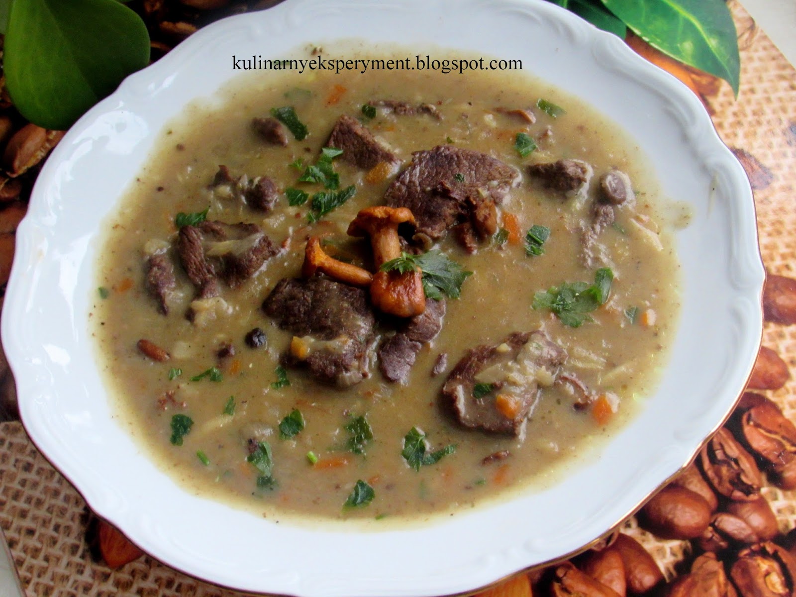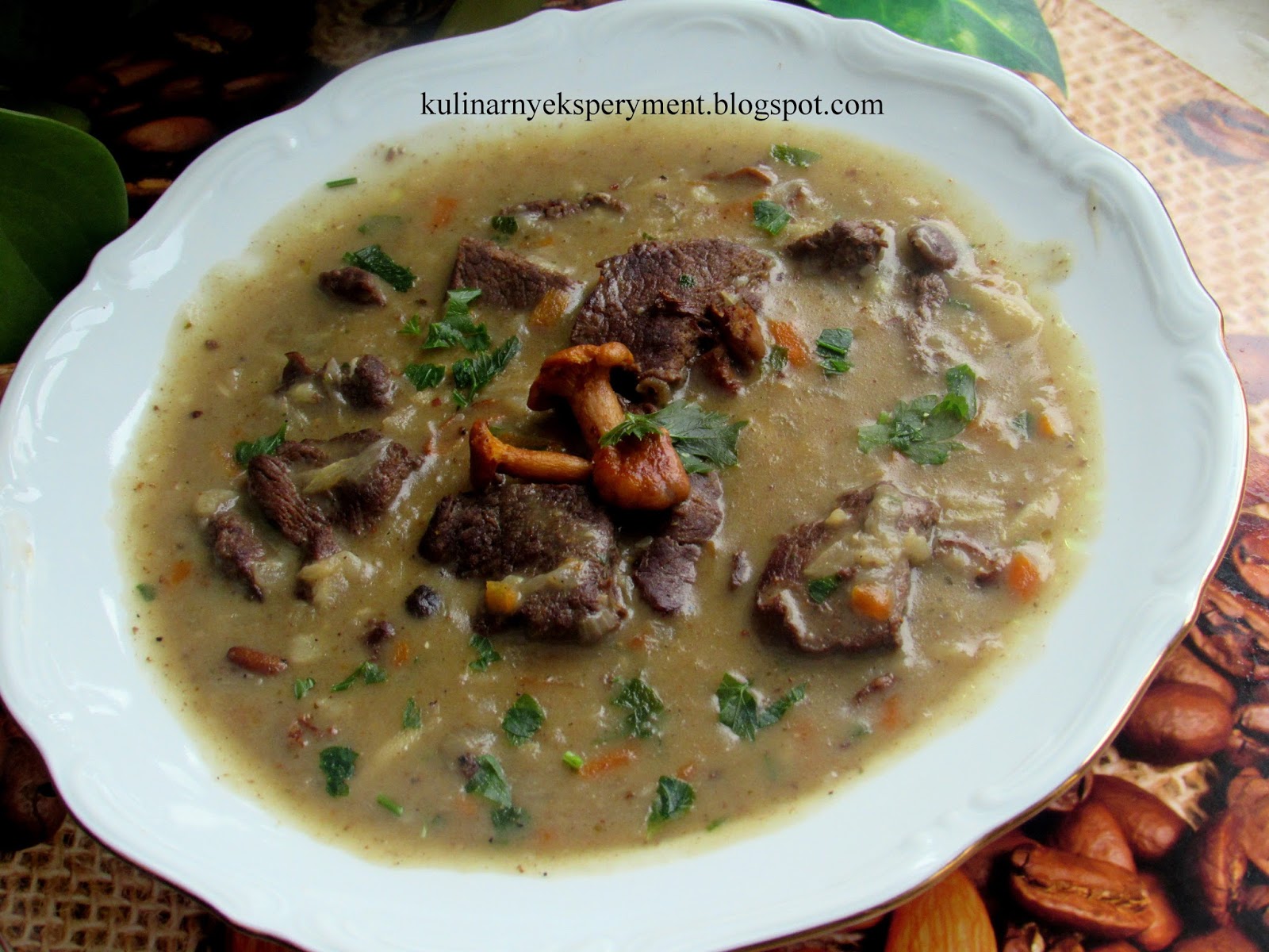 Schab myjemy, kroimy w dwu centymetrowe paski oprószamy solą, solą ziołową, pieprzem dodajemy przeciśnięty przez praskę czosnek i odstawiamy na kilka godzin do lodówki. Po tym czasie cebulę kroimy w piórka dodajemy do mięsa i podsmażamy na 4 łyżkach oleju. Smażymy na wolnym ogniu około 15 minut często mieszając aby mięso się nie przypaliło, w razie konieczności podlewamy trochę wody. Marchew, pietruszkę i selera ścieramy na tarce o dużych oczkach. Mięso wraz z cebulą przekładamy do garnka dodajemy jarzyny, liście laurowe, ziele, pieprz ziarnisty, jałowiec i zalewamy 1,5 l wody. Wrzucamy kostkę rosołową i gotujemy na wolnym ogniu około 1,5 godziny. W połowie gotowania dodajemy oczyszczone i pokrojone w paski kurki, natkę pietruszki i wino. Doprawiamy solą, pieprzem, vegetą, słodką i ostrą papryką. W czasie gotowania gdy wywar odparuje dodajemy jeszcze 2- 3 szklanki wody. Gdy mięso będzie już miękkie śmietanę mieszamy w 1/2 szklance wody, dodajemy mąkę, 2 łyżki gorącego wywaru i zagęszczamy sos.