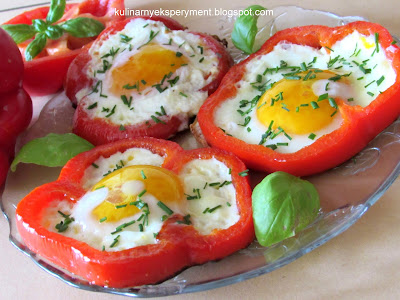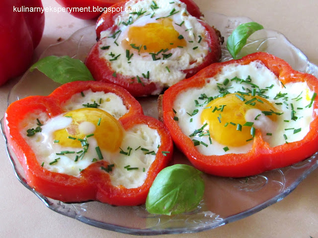 Paprykę myjemy kroimy w krążki, posypujemy odrobiną soli podsmażamy na łyżce oleju. W środek papryki wbijamy delikatnie jajko aby nie wypłynęło poza paprykę.Na patelnię wlewamy łyżkę oleju i smażymy aż białko się zetnie. Posypujemy posiekanym szczypiorkiem