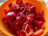 - Paprykę przekładamy do garnka gotujemy na wolnym ogniu około 10 minut. Po tym czasie paprykę odcedzamy na sicie.