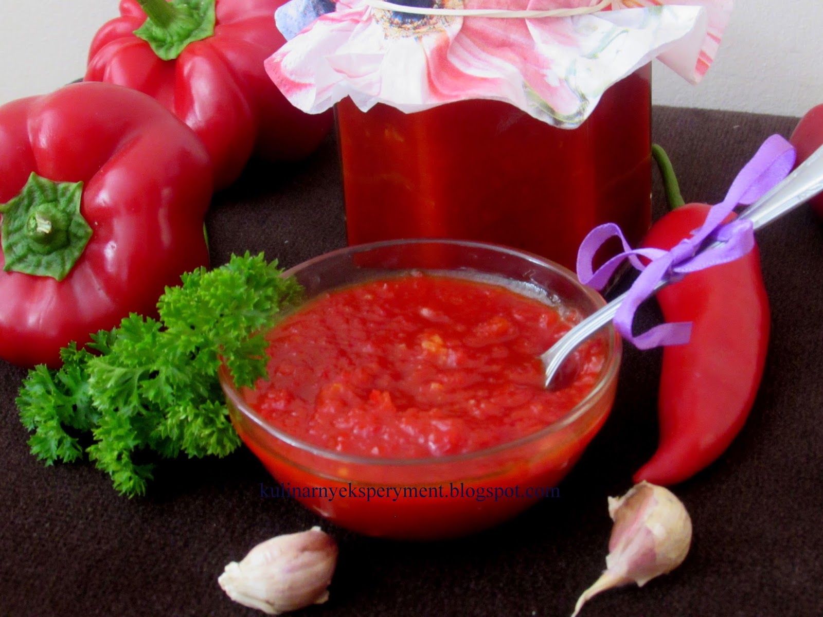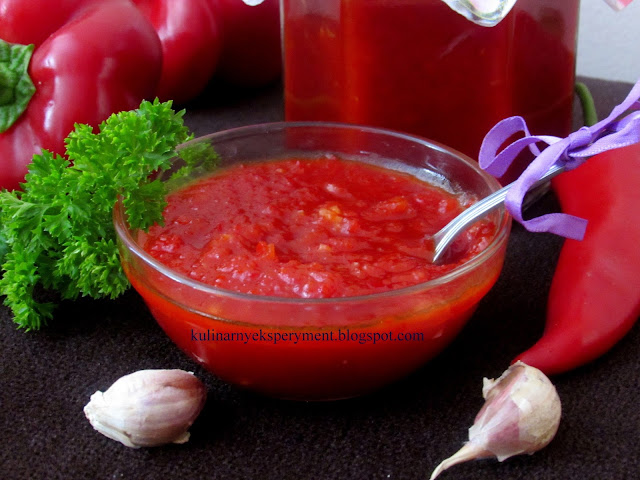 - Do odcedzonej pasty dodajemy cukier, olej, ocet, sól, koncentrat pomidorowy i przeciśnięty przez praskę czosnek. Gotujemy na wolnym ogniu około 20 minut. Gorące przekładamy do umytych i suchych słoików. Pasteryzujemy 7 minut od momentu zawrzenia wody. Słoiki odwracamy do góry dnem.