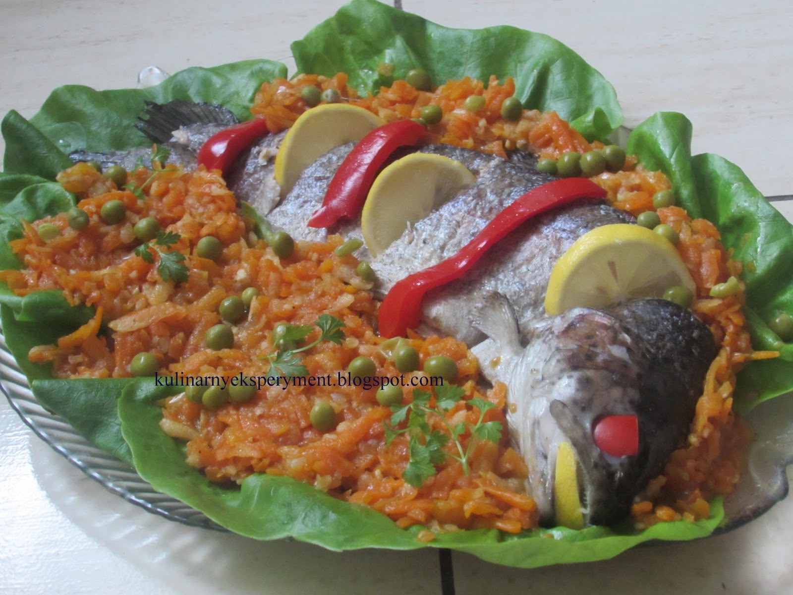 3.Na półmisek wykładamy liście sałaty układamy ostudzonego pstrąga, robimy trzy nacięcia w które wkładamy po plasterku cytryny. Wokół ryby układamy podsmażone warzywa i posypujemy groszkiem konserwowym. Oko robimy z kawałka papryki konserwowej a w środek pyszczka wkładamy ćwiartkę cytryny. Dekorujemy paskami papryki konserwowej i natki pietruszki.