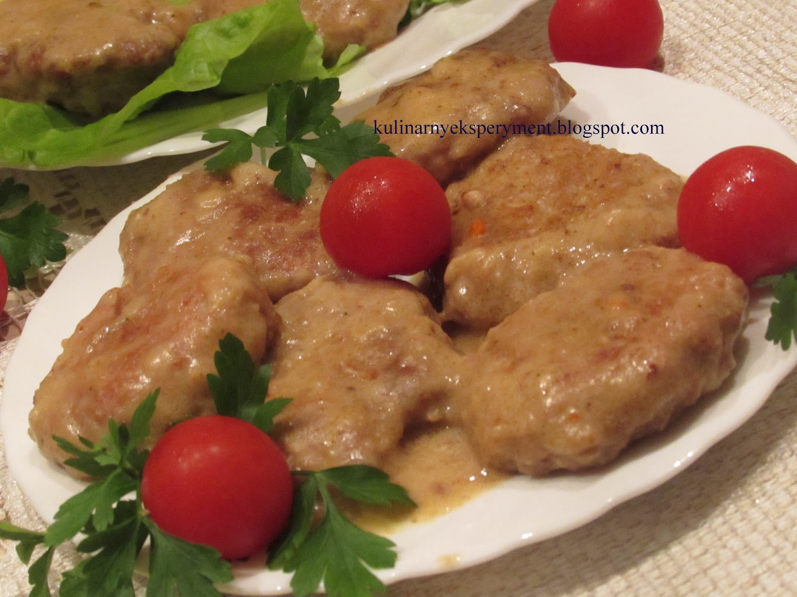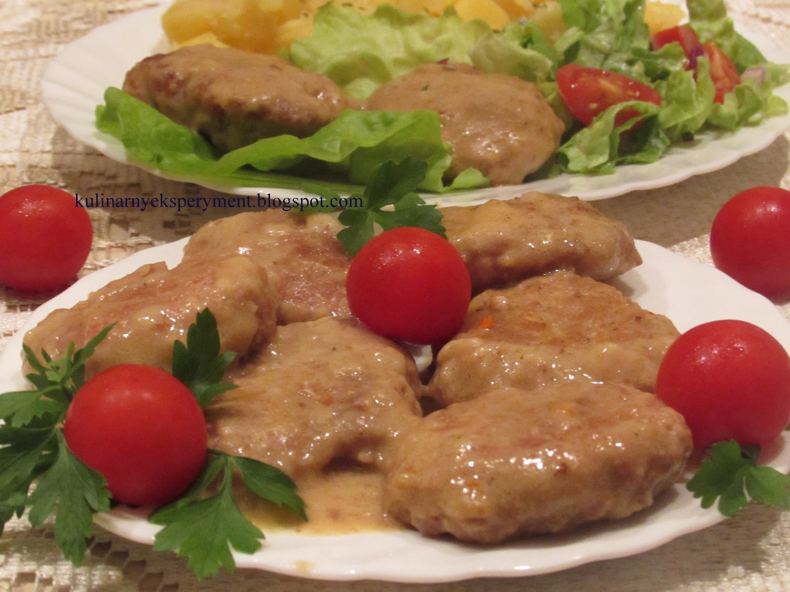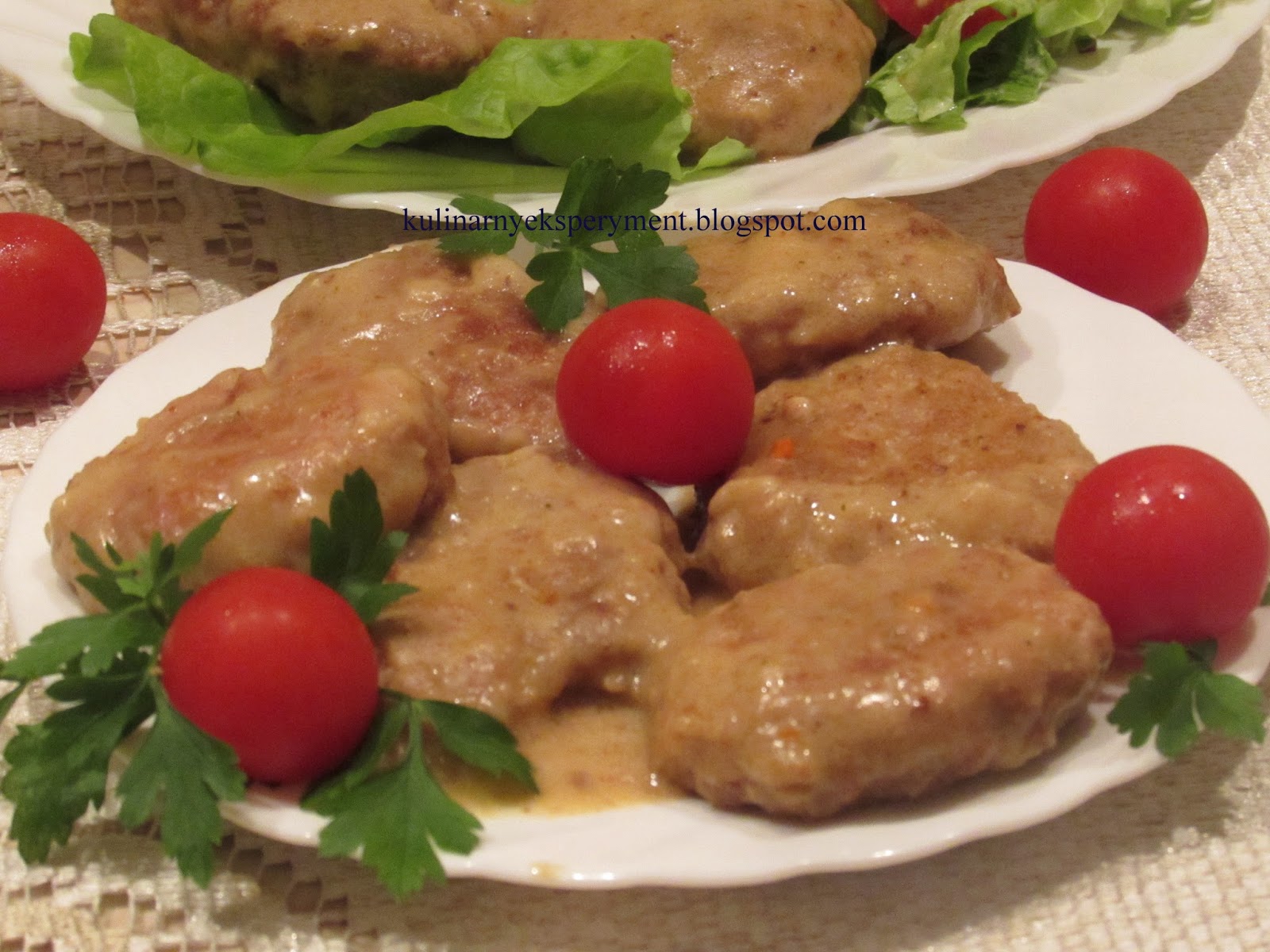2. Do szerokiego rondelka wlewamy wodę dodajemy kostkę rosołową i układamy ciasno kotlety. Dusimy na wolnym ogniu około 15-20 minut. Do sosu dodajemy śmietanę i mieszamy. Mąkę mieszamy z 5 łyżkami wody i dodajemy 2 łyżki gorącego wywaru i zagęszczamy sos. Dusimy jeszcze około 5 minut aż sos zgęstnieje.