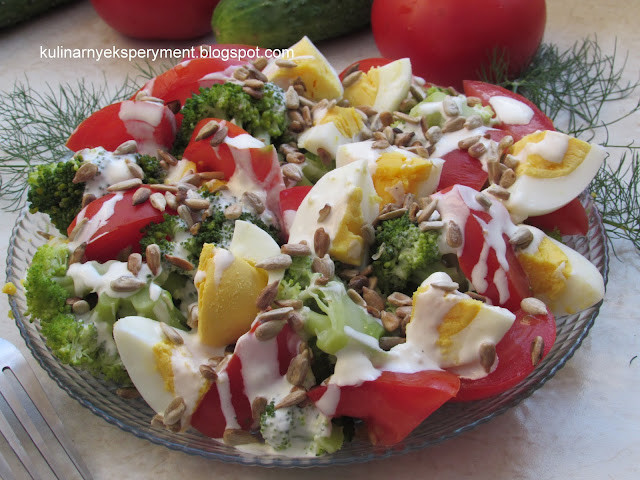 Brokuł dzielimy na małe różyczki, gotujemy w osolonej wodzie do miękkości odcedzamy i przelewamy zimną wodą. Pomidory myjemy i kroimy w większe paski. Jajka gotujemy na twardo obieramy i kroimy w ósemki. Słonecznik prażymy na suchej patelni często mieszając aż zbrązowieje. Śmietanę mieszamy z majonezem dodajemy przeciśnięty przez praskę czosnek odrobinę soli i pieprzu. Na płaskim talerzu albo w przezroczystej salaterce układamy brokuł dodajemy pomidory i jajka. Sałatkę polewamy sosem czosnkowym i posypujemy prażonym słonecznikiem.