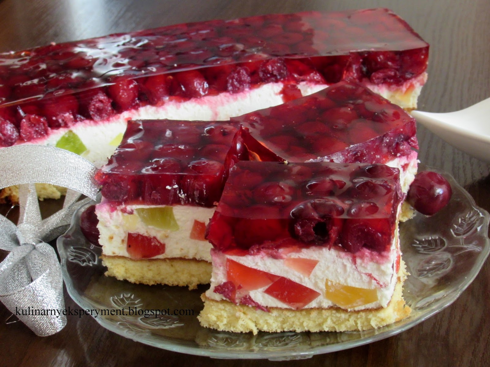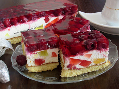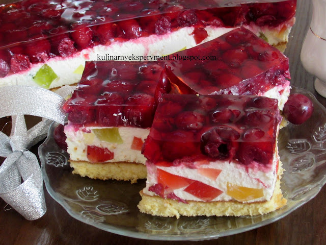 Białka oddzielamy od żółtek, z białek ubijamy sztywna pianę i dodajemy pojedynczo pozostałe składniki. Ciasto wlewamy do blaszki wyścielonej papierem do pieczenia i pieczemy 25 minut w temperaturze 180C. Studzimy i ściągamy papier. W między czasie galaretki rozpuszczamy osobno w szklance wody. Wlewamy na talerz i zostawiamy aby całkowicie stężał natomiast wiśnie osączamy na sitku z nadmiaru soku.