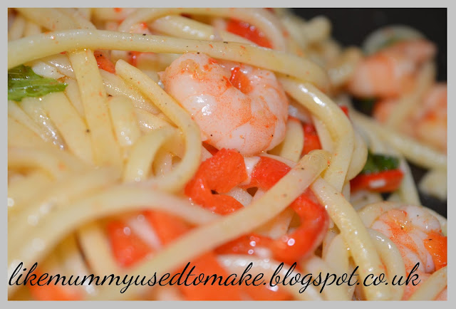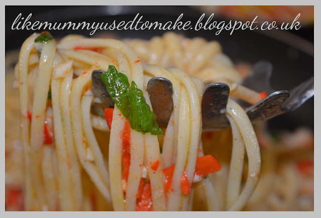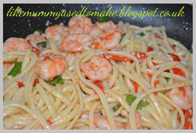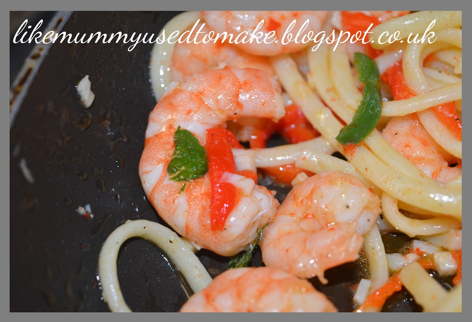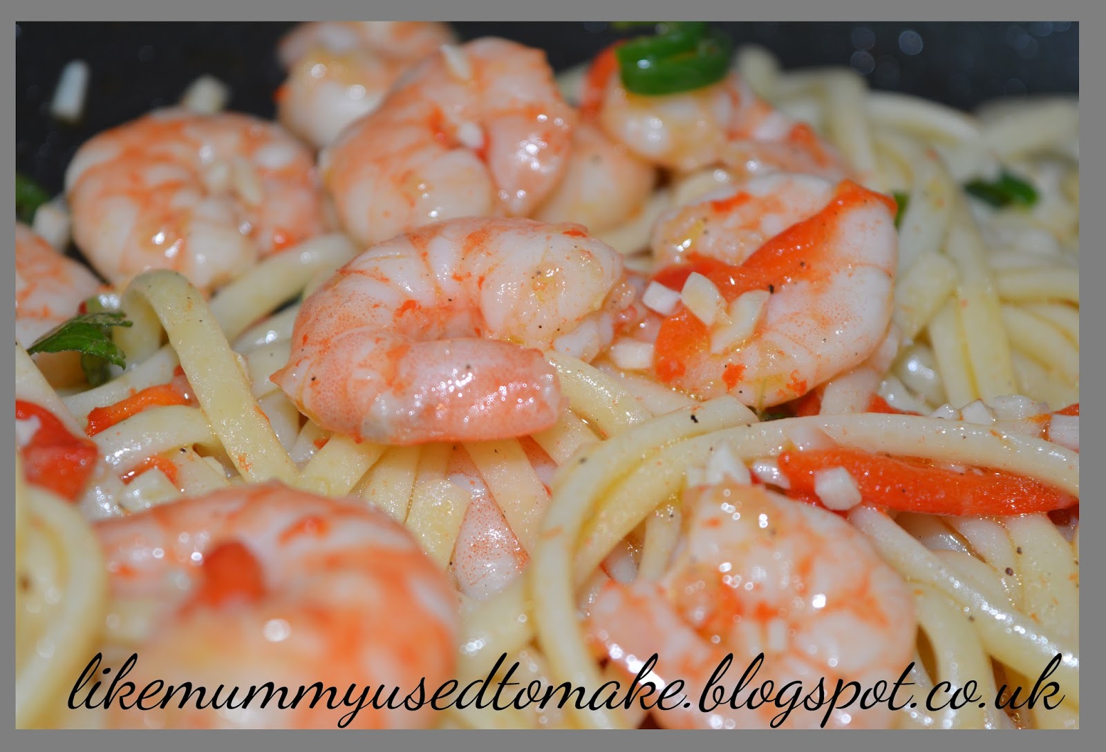 METHOD First cook pasta following pack instruction.Meanwhile heat the olive oil in the frying pan, add garlic and green chili pepper (cut into half moon). Fry gently over a low heat until the garlic is soft but not browned.Then fry red pepper (cut into thin strips), add prawns and cook for 4 minutes. Add garlic with chili and linguine, season with salt and pepper. Stir-fry for 2 more minutes, add lemon juice and mint.