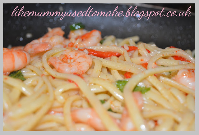 METHOD First cook pasta following pack instruction.Meanwhile heat the olive oil in the frying pan, add garlic and green chili pepper (cut into half moon). Fry gently over a low heat until the garlic is soft but not browned.Then fry red pepper (cut into thin strips), add prawns and cook for 4 minutes. Add garlic with chili and linguine, season with salt and pepper. Stir-fry for 2 more minutes, add lemon juice and mint.