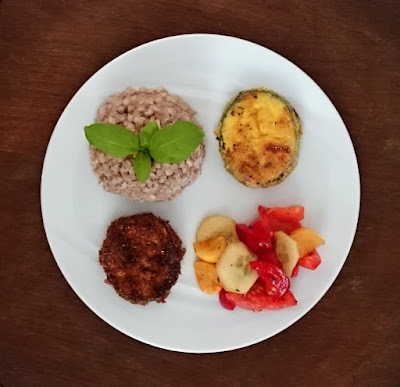 Coat zucchini slices in egg mixture + bran and in egg mixture + corn flour. Add white buckwheat (the regular one, not roasted) and a salad: tomatillo, bell pepper and cucumber. Bon appetite!