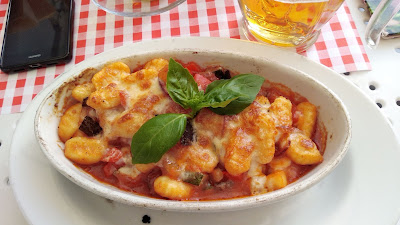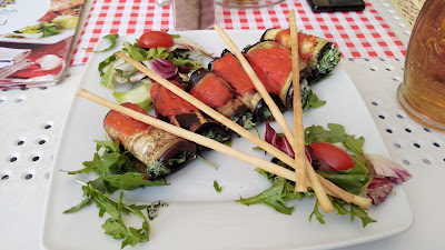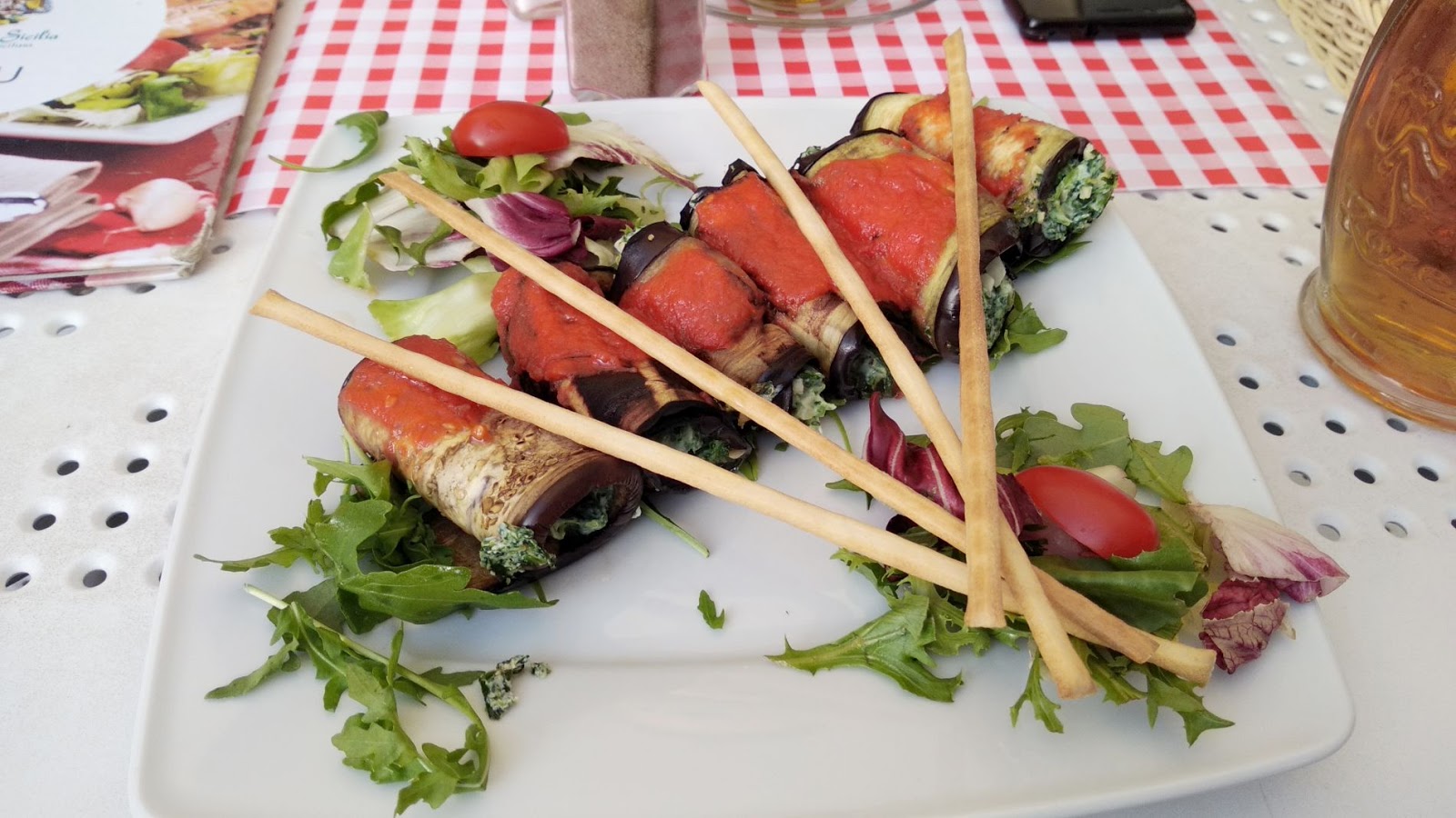 Ristorante Sicilia: bardzo smacznie. Ogródek przy rynku. Na zdjęciach: roladki z bakłażana nadziewane szpinakiem i gnocci w sosie pomidorowym. Dania przygotowuje dyplomowany szef kuchni z Sycylii. Jeszcze wrócę tu na pizzę, danie z makaronem i tiramisu. Ponoć tą restauracją zachwycała się Magda Gessler...