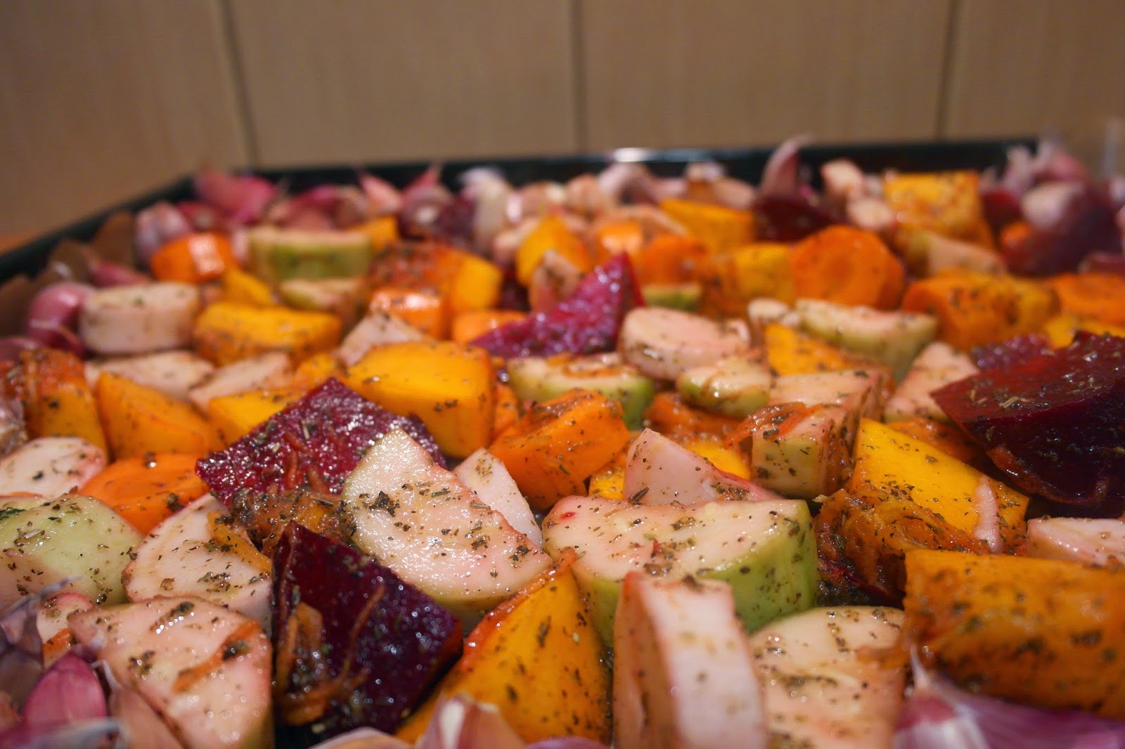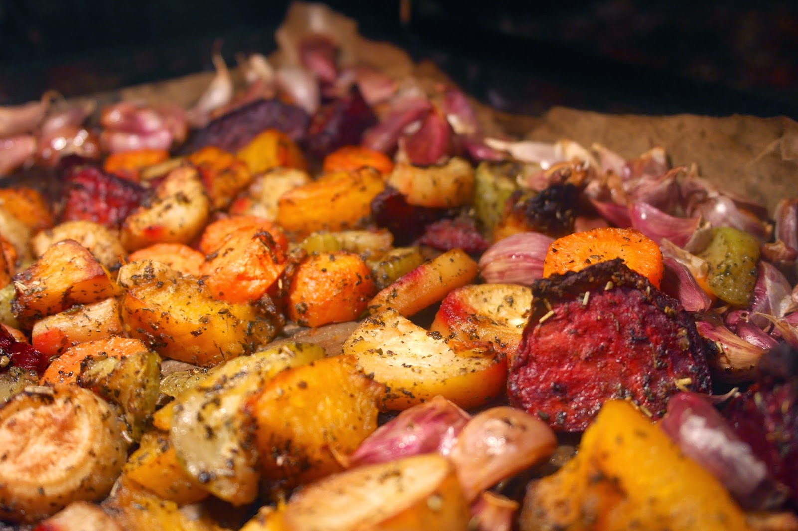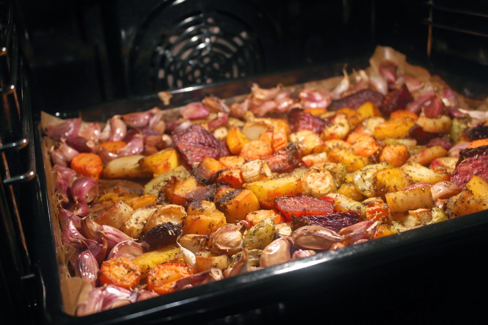 Czosnek rozdzielamy na pojedyncze ząbki (nie obieramy z łupiny) a warzywa kroimy na duże kawałki. Wszystko umieszczamy w dużej misce, polewamy olejem i posypujemy ziołami. Warzywa dokładnie mieszamy rękami. Wysypujemy na blachę uprzednio wyłożoną papierem do pieczenia. Pieczemy w temp. 180st C z termoobiegiem przez 30-45min. Podczas pieczenia warto kilkakrotnie przemieszać warzywa, wtedy będą dobrze wypieczone z każdej strony.