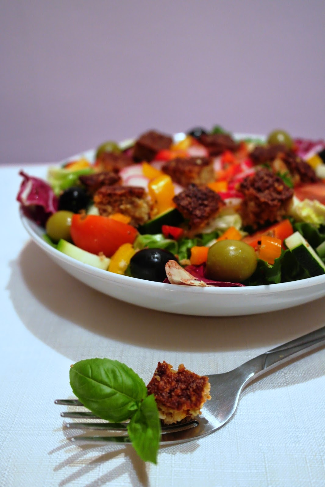 Migdały moczymy przez kilka godzin w wodzie, a następnie mielimy na gładką masę. Dodajemy ocet, oliwę, przyprawy i przeciśnięty przez praskę czosnek. Kawałki różnokolorowych papryk kroimy w bardzo drobną kosteczkę i dokładnie mieszamy z masą. Do małego kwadratowego naczynia żaroodpornego (10x10cm) wyłożonego papierem do pieczenia przekładamy migdałowy serek.