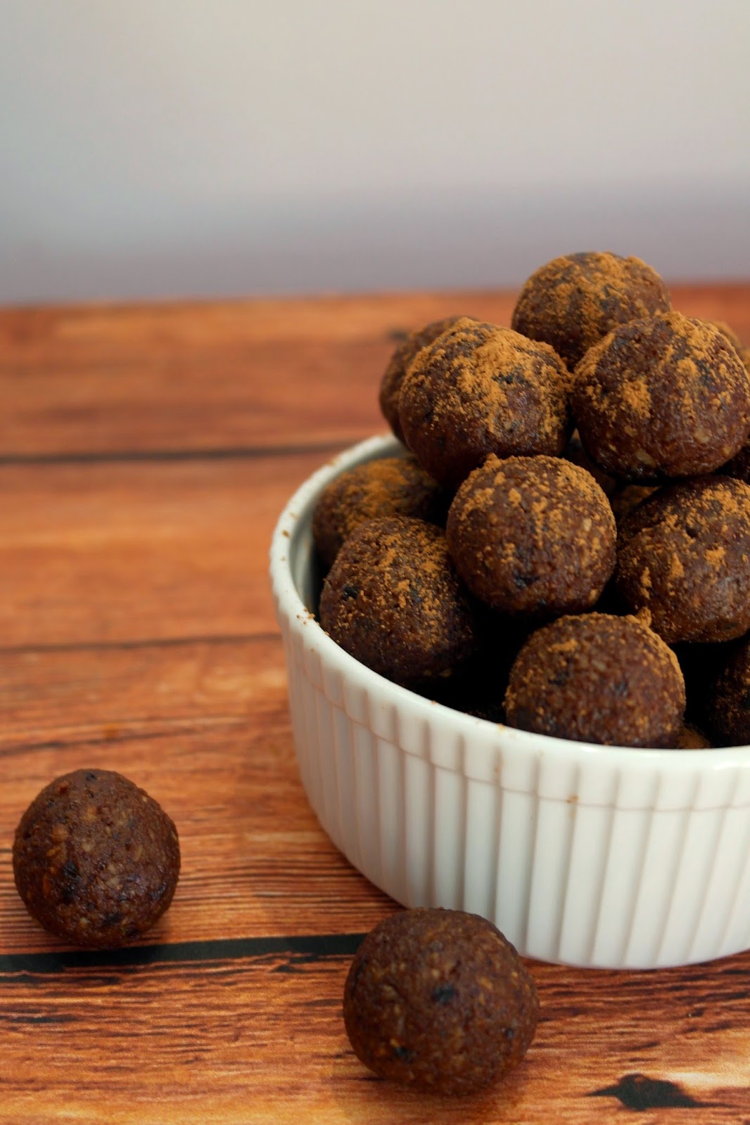 Wykonanie:Orzechy moczymy przez noc w wodzie, rano odsączamy. Miksujemy na gładką masę z śliwkami, daktylami i karobem bądź kakao. Formujemy małe kuleczki i schładzamy w lodówce przez ok.1-2h.