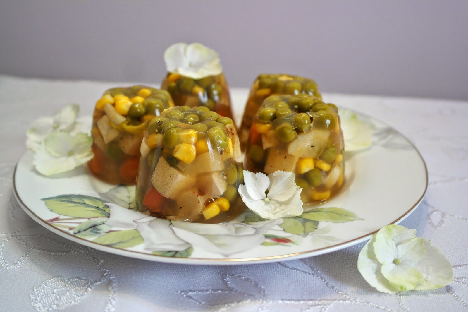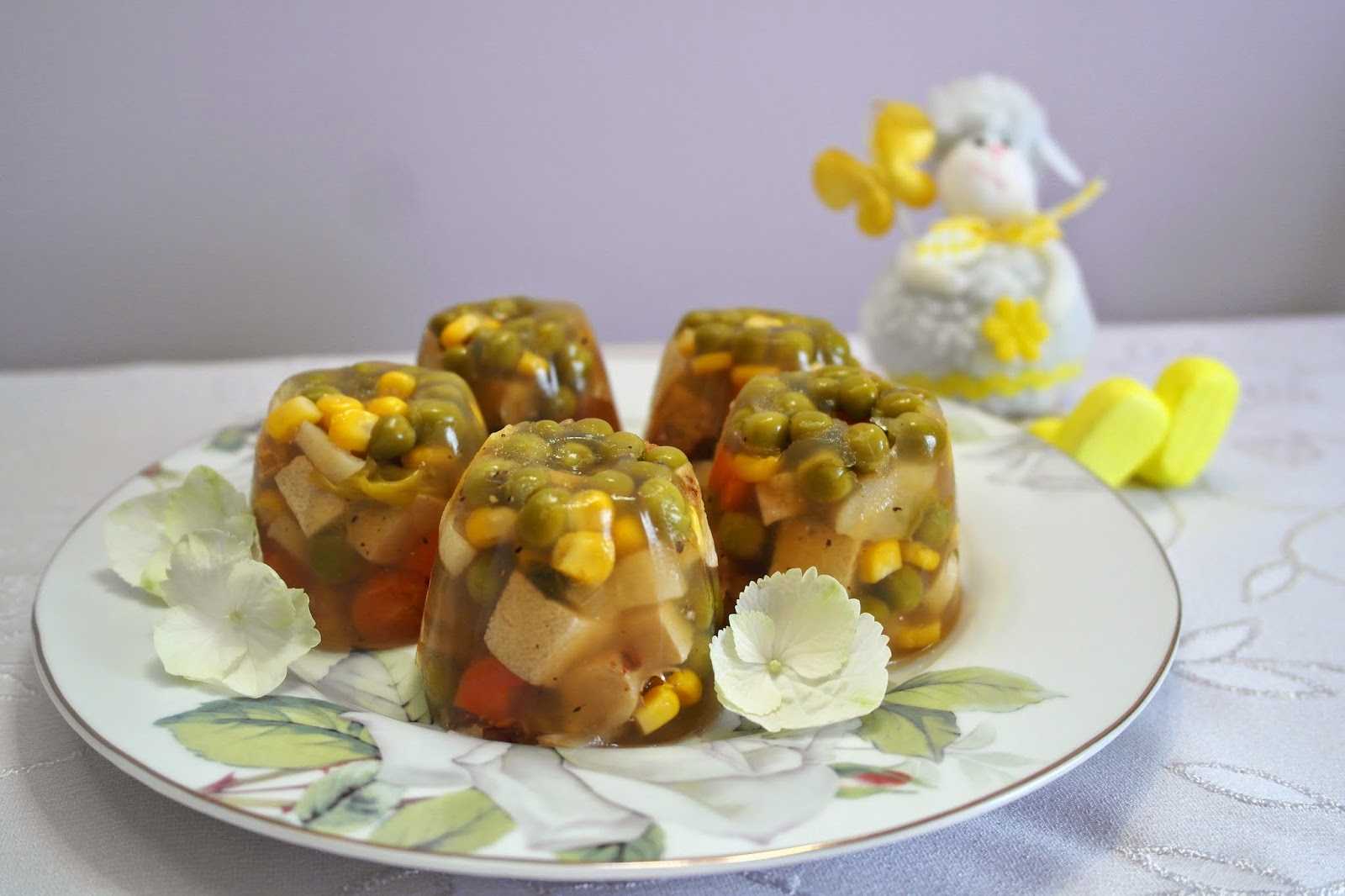 Wykonanie:Warzywa wraz z przyprawami (ziele angielskie, liście laurowe, sól i pieprz) gotujemy do miękkości. Po ok.30min odcedzamy warzywa i po ostygnięciu kroimy razem z tofu w drobną kostkę. Z bulionu wyjmujemy również przyprawy. Podgrzewając bulion na średnim ogniu i mieszając cały czas dodajemy sok z cytryny, sos sojowy i agar. Odstawiamy do ostygnięcia.