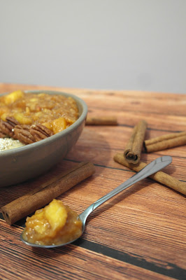 Dziś polecam jabłko-brzoskwinia-mango jaglankę z orzechami pekan i amarantusem! Składniki: - 1/2 jabłka