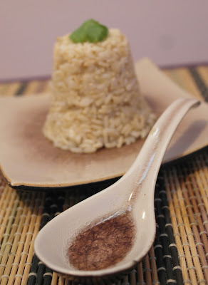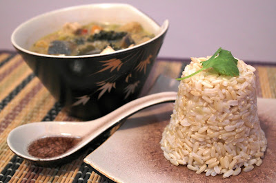 Curry podajemy w miseczce i posypujemy świeżymi listkami kolendry. Ryż przekładamy do malutkiej miseczki, ubijamy łyżką i przekładamy na talerzyk tak jak robi się babki z piasku :-D). Ryż najlepiej podawać ostudzony, bo jego łagodny smak przełamuje pikantność curry.