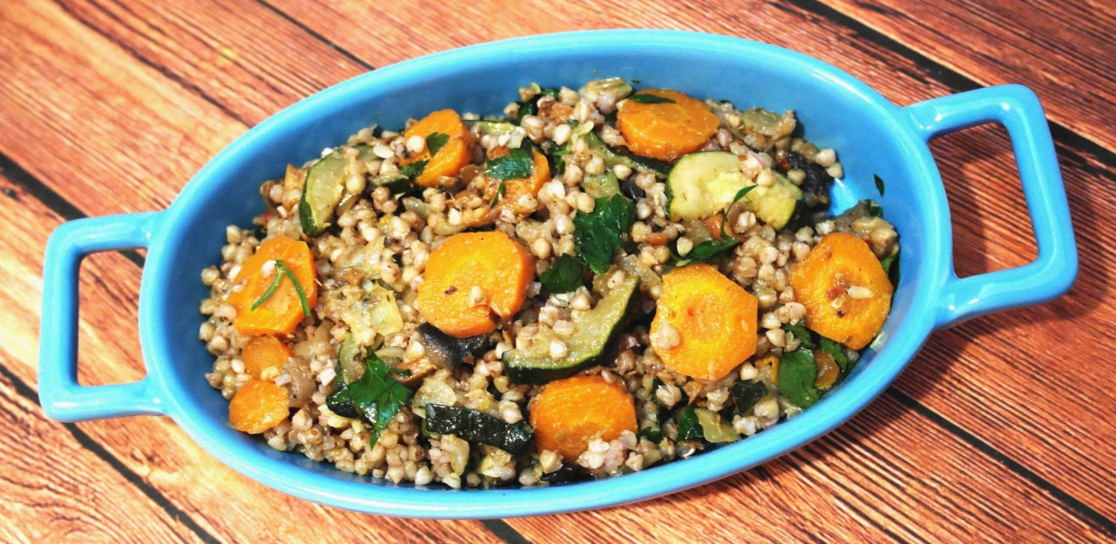 Kaszę gryczaną gotujemy przez ok.15min na wolnym ogniu. W tym czasie na oliwie podsmażamy plasterki marchwi. Po 5min dodajemy pokrojoną cebulę, cukinię i kurki. Po 10min dodajemy grykę, przyprawiamy solą oraz pieprzem. Pozostawiamy na wolnym ogniu pod przykryciem przez kolejne 10min, od czasu do czasu mieszamy. Gdy danie przełożymy na talerz, posypujemy świeżą pietruszką.