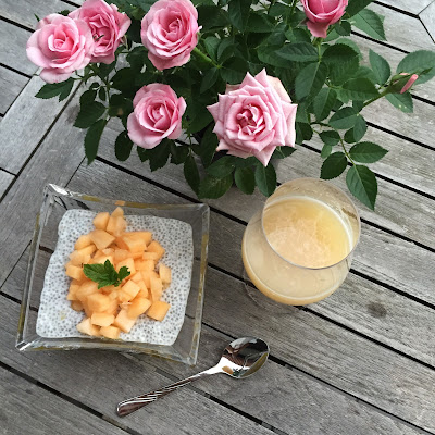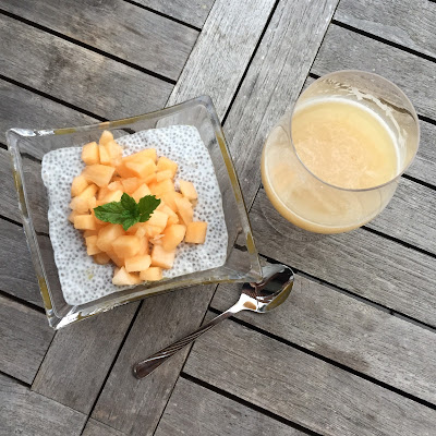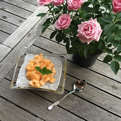 Jak dotąd posypywała bułkę lub chleb nasionami, ale nigdy nie próbowała ich w jakikolwiek sposób przyrządzić. Dlatego postanowiłam urozmaicić jej podanie i zaproponowałam pudding chia na mleku kokosowym, którego też nigdy nie miała okazji spróbować. W markecie udało nam się znaleźć odpowiednio dojrzałe mango (nie za twarde i nie za miękkie), a w domu czekał w lodówce wcześniej zakupiony miodowy melon.
