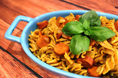 Dziś polecam razowy makaron z sojowymi parówkami oraz cebulką!