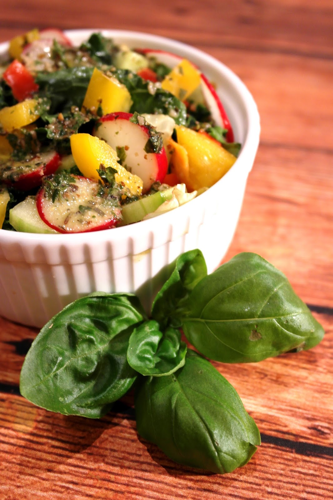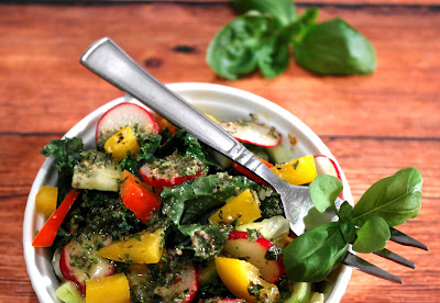 Podstawą każdej mojej sałatki jest mix różnych sałat z dodatkiem rukoli, roszponi, szpinaku czy jarmużu. Po obowiązkowym opłukaniu mieszam je ze sobą i dodaję do nich górę świeżych warzyw, ziół i kiełków. To co znajdzie się akurat na talerzu zależy od tego co dostanę na targu czy w sklepie, bo przecież nie przez cały rok dostaniemy np.jarmuż czy pomidory malinowe.