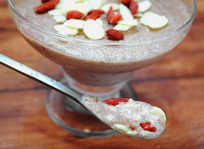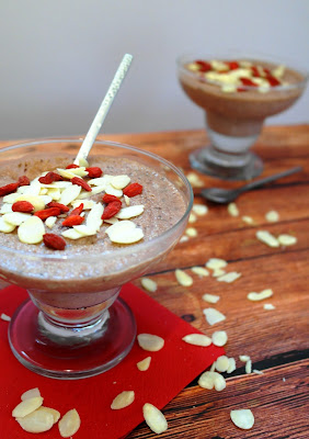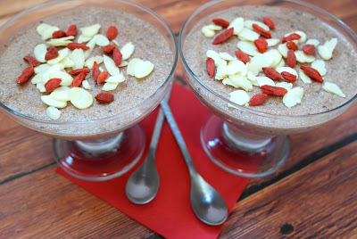 Zawartość rondelka przelać do miseczek lub pucharków, a wierzch deseru udekorować migdałami i jagodami goi.