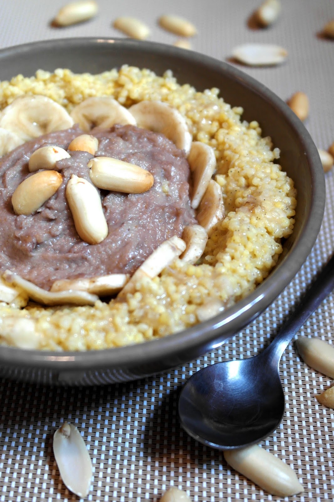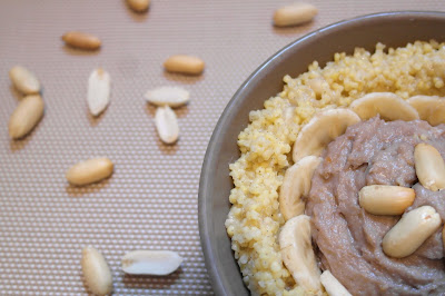 Kaszę jaglaną ugotować na mleku i wodzie. Można dodać odrobinę słodu/cukru jeśli ktoś ma ochotę na słodszą wersję. W blenderze umieścić orzechy ziemne i przez 2min mielić na wysokich obrotach. Dodać 1/2 banana oraz szczyptę soli i dalej mielić do uzyskania gładkiej masy.